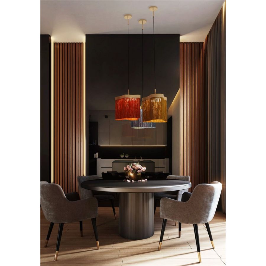 The Arcipelago collection is composed of suspension and table lights, characterised by the Trevira CS fire-resistant shade with fringes and a satin brass body – details that enrich the product. The light source is an LED customised and dimmable plate, which can be regulated through a three-phase dimmer switch on the base in the table version.