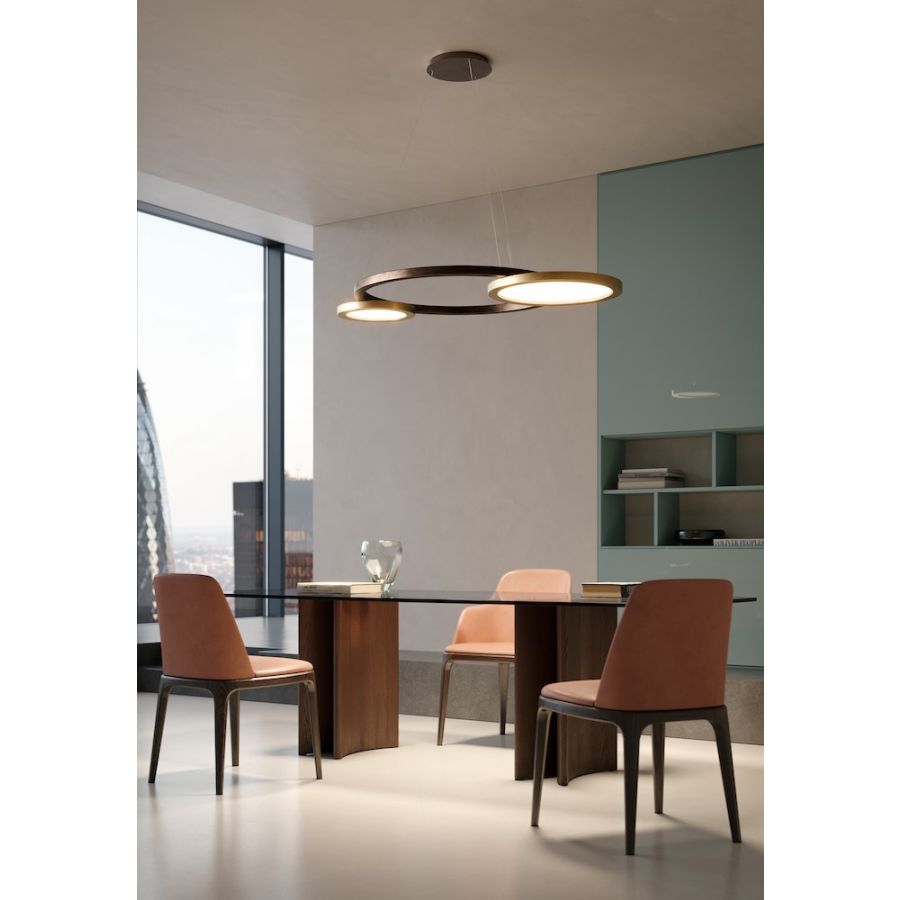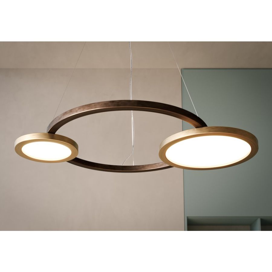 A suspension light or chandelier inspired by the solar eclipse, it plays with light, shadows and overlapping elements. It consists of three multi-sized rings, made of wood with a light and dark bronze finish, using the new techniques of painting with metal powders – the effect is that of brushed bronze on metal. The main light, dimmable, is now inserted in the lateral rings, and is diffused by the special plastic material with veins, which is reminiscent of marble.