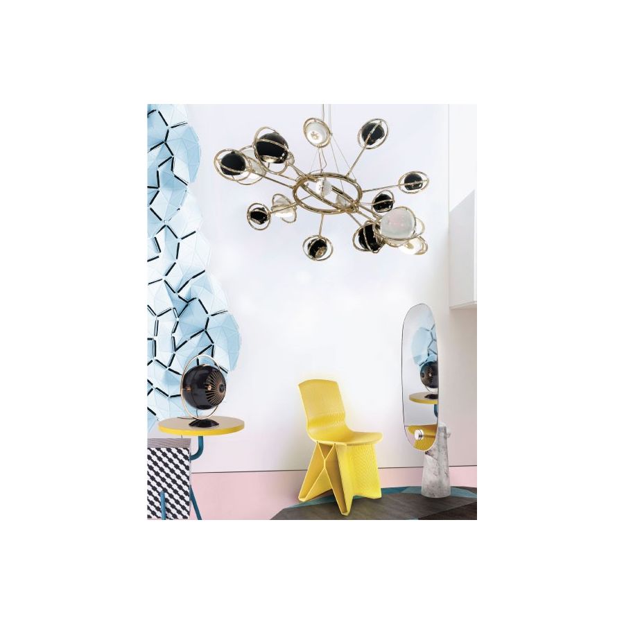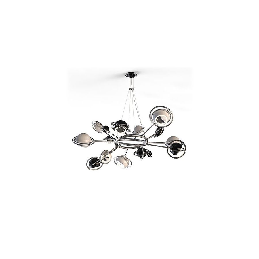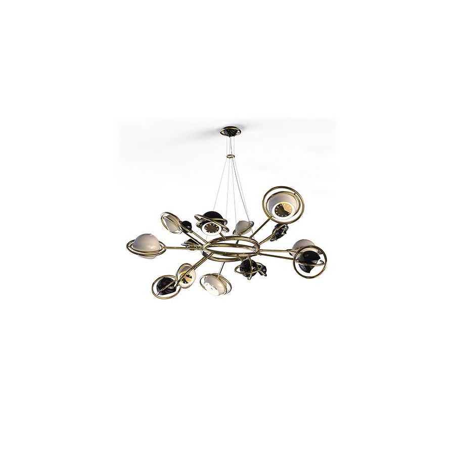 Designed as a tribute to the mid-20th century race to space, Cosmo modern chandelier is inspired by space, galaxies and the planets that surround us. It is a memorable lighting fixture, with very unique details that make it the luxurious bespoke design piece that it is. Handmade in brass and steel, the body is covered by a gold-plated finish, while the stainless steel shades are lacquered a glossy black and glossy white on the outside. It is an intricate design piece to put on display at the entrance of a modern hotel, or to use as a modern dining room lighting fixture.