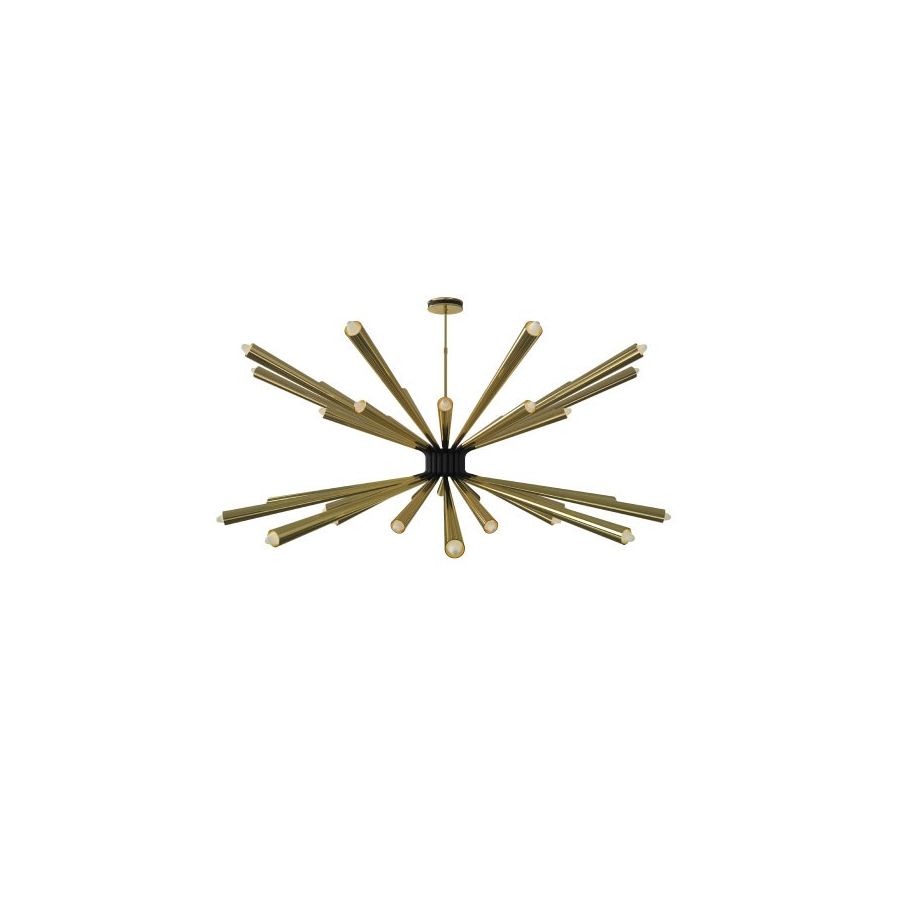 Inspired by the acclaimed jazz trumpet player Tommy Dorsey, this mid-century suspension chandelier is a unique lighting fixture that embodies the musicality of the 1950s. Allying the best of ancient techniques with the modern expertise of high- craftsmanship, Dorsey is a handmade brass chandelier, with aluminum lamp shades. The telescopic tubes that make up the body boast a gold-plated finish, while the lamp shades and center are lacquered a matte black. It is a unique chandelier, perfect for a mid-century hotel lobby, or an art deco-inspired restaurant. It can also be used in private residences, especially as a dining room lighting fixture.