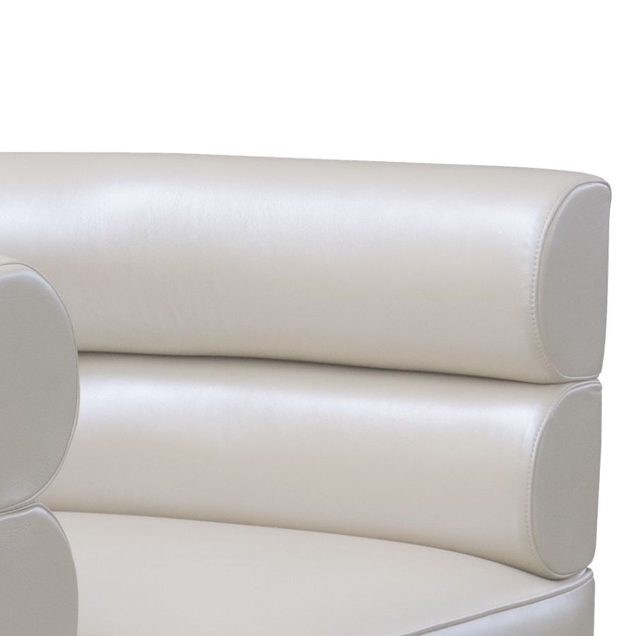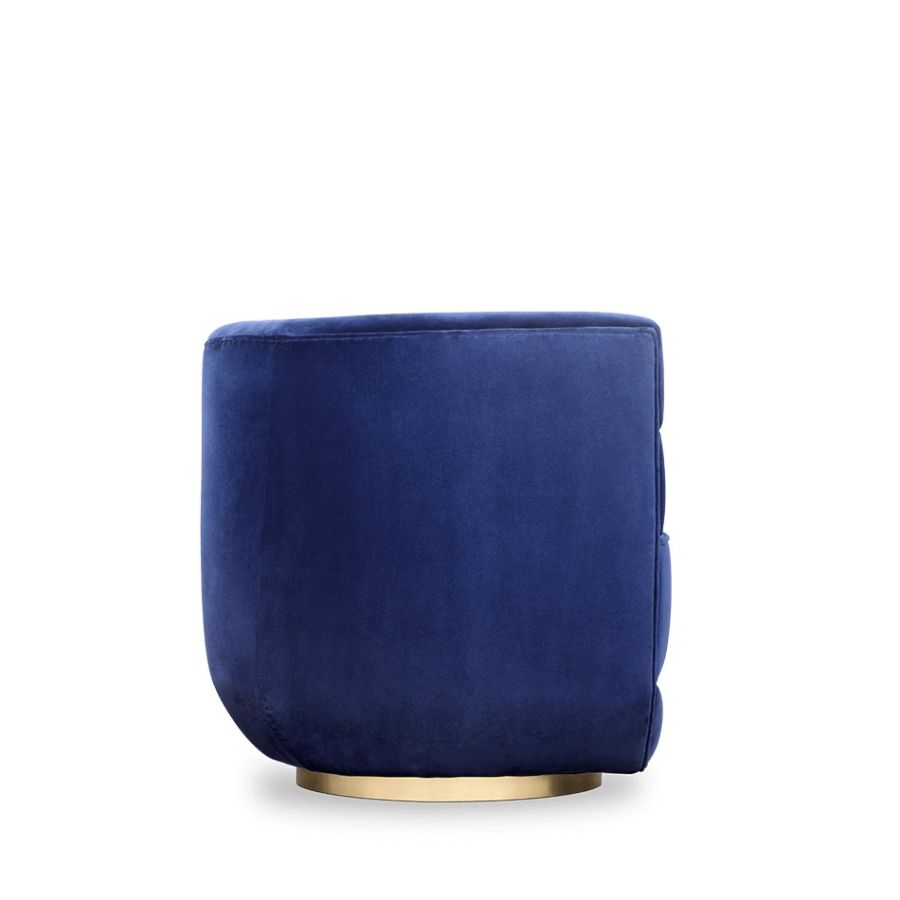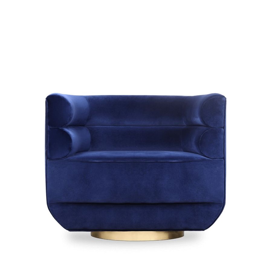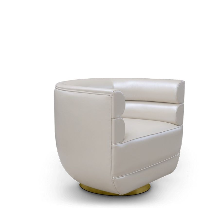 Inspired by mid-century retro designs, Loren features a simple and sophisticated design with a swivel golden brass base, and it is upholstered in leather. Due to its low back, it's a versatile chair fit for any room. The compact and curved look along with its rolled arms, make this a luxury statement piece.