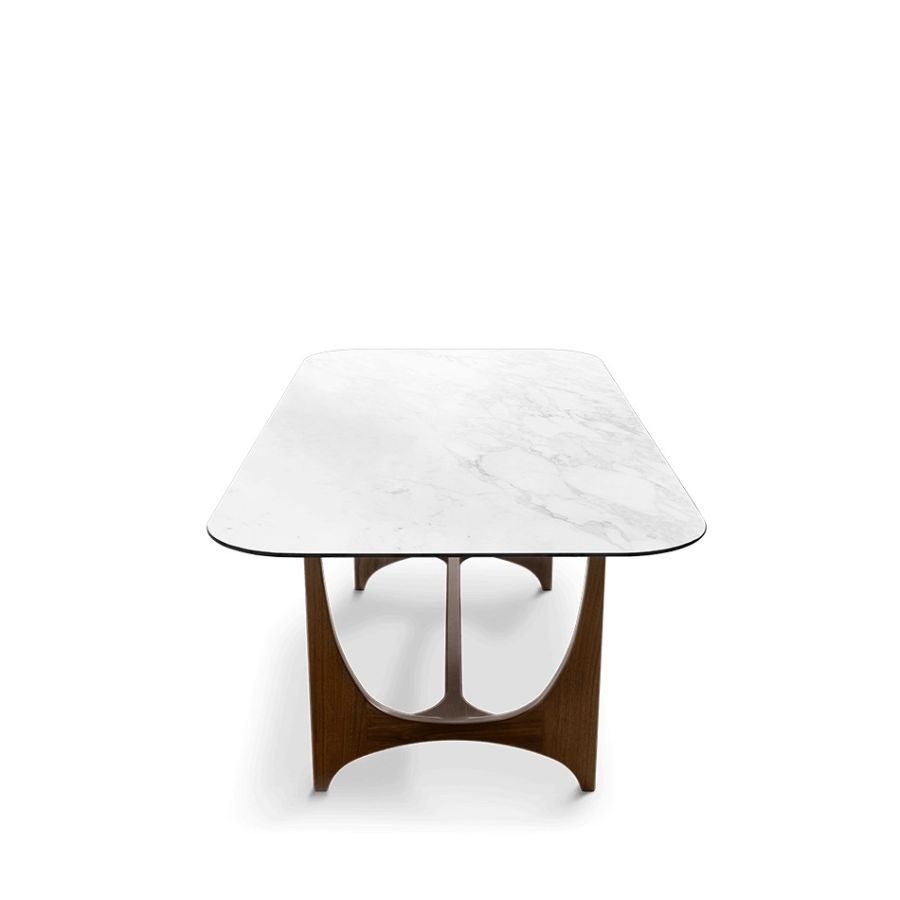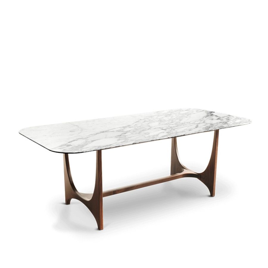Named after the Italian cinema legend, Alberto Sordi. this dining table, reminiscent of Oscar Niemeyer's architectural shapes, with curvilinear wooden legs that elegantly blend with the round corners of its marble top. A modernist masterpiece, fusing art and design flawlessly.