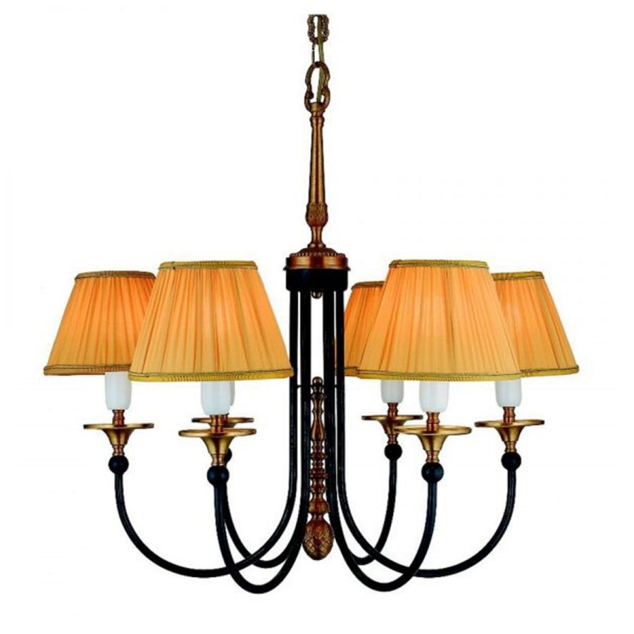 Six-light chandelier in antique brass and decorated metal, fabric lampshades.
