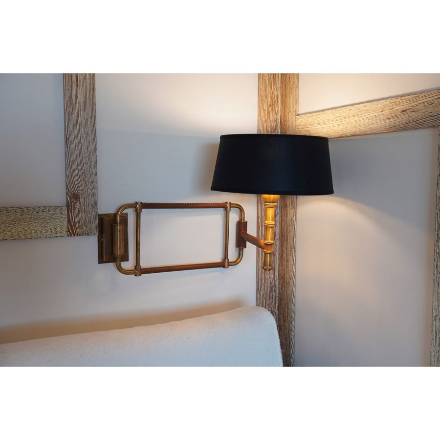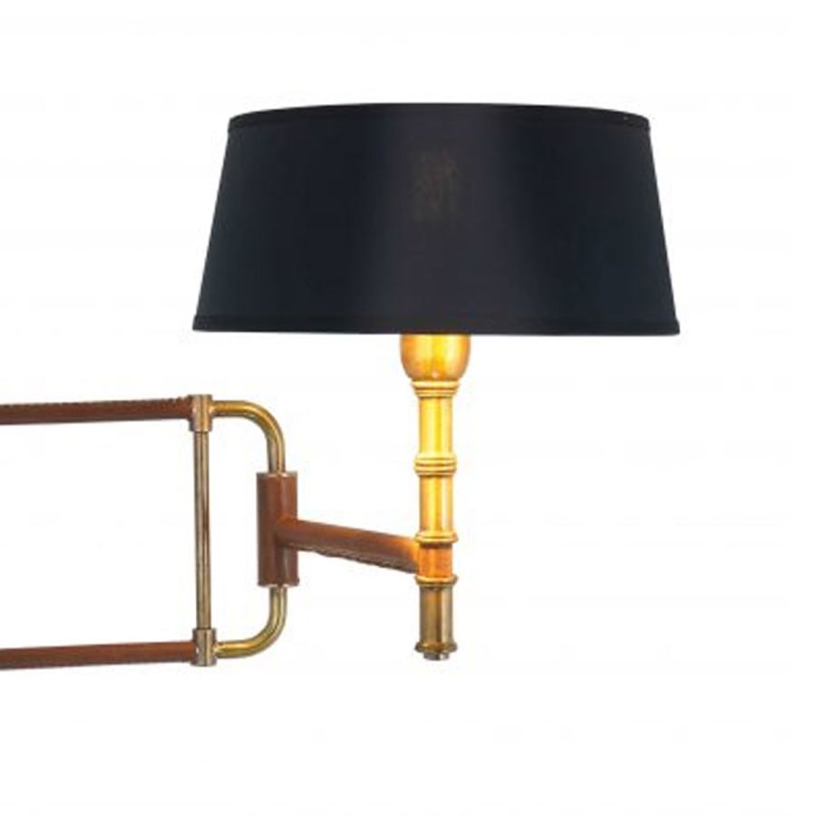 Wall lamp in brass with aged brass finish and details covered in hand-stitched leather. Fabric lampshade.