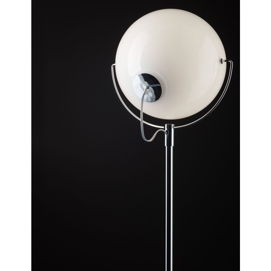 Lampa stojąca z polerowaną, chromowaną konstrukcją. Regulowany polerowany biały dmuchany szklany dyfuzor.