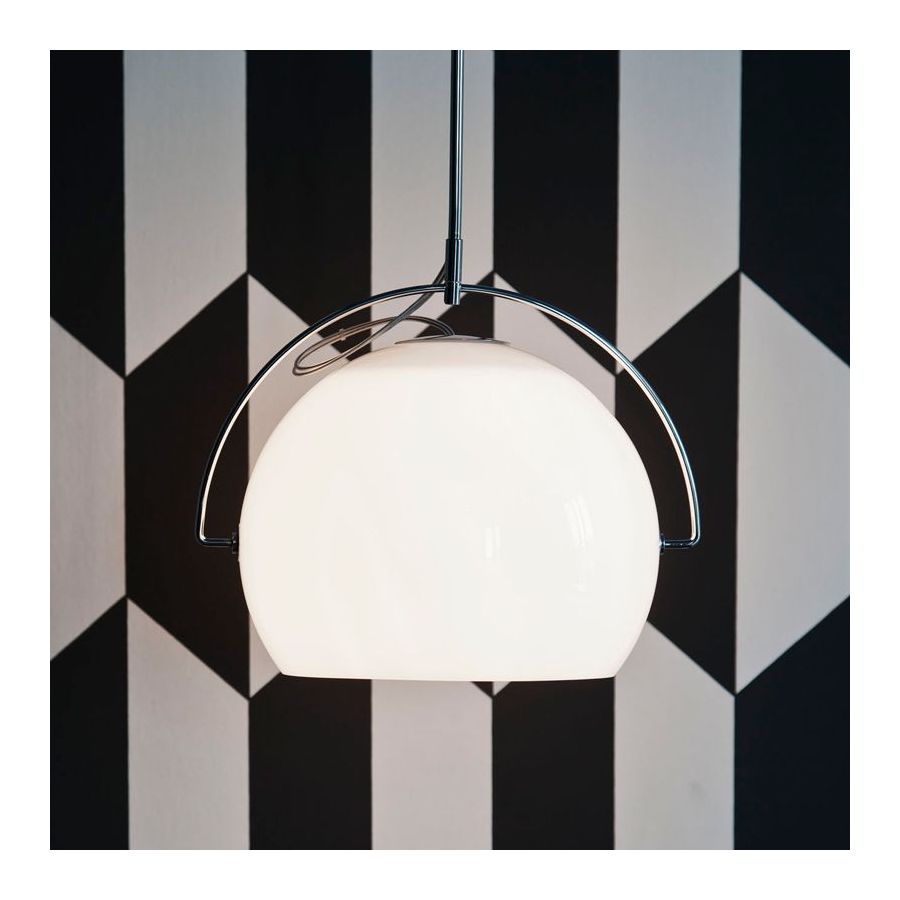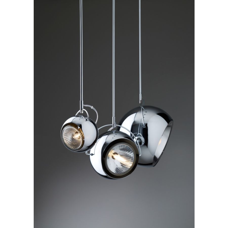 Lampa wisząca z polerowaną, chromowaną metalową konstrukcją i regulowanym dyfuzorem.