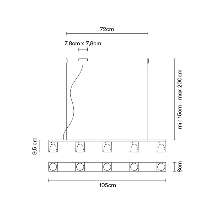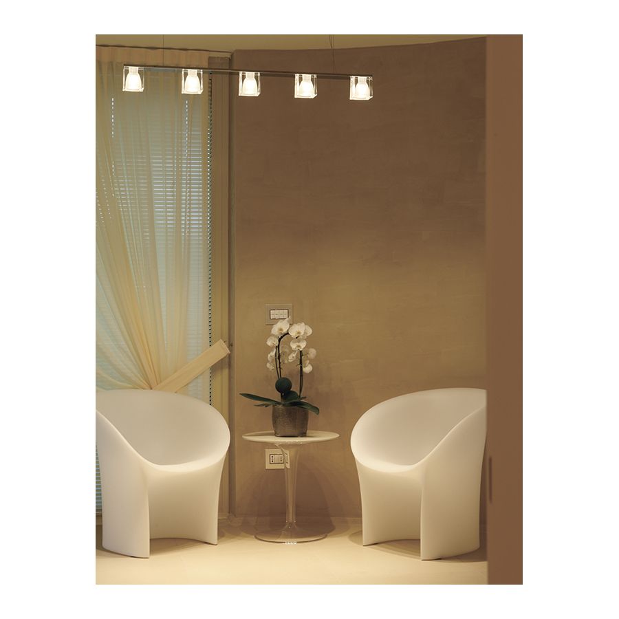 Lampa wisząca Cubetto z pięcioma oprawami ma przezroczyste kryształowe, czarne i białe dyfuzory. Emitowane światło jest halogenowe lub LED i w znacznym stopniu wzbogaca przestrzeń wokół niej. Lampę można zainstalować w wielu obszarach domu prywatnego, w sali spotkań w miejscu pracy lub w barze restauracji.