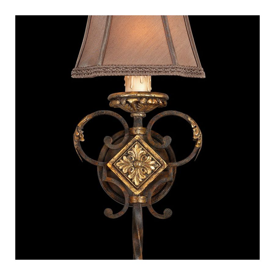 Wall sconce in antiqued finish. Features hand sewn silk shade with braided trim.