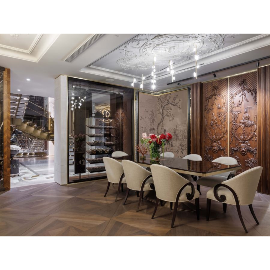 A collection centred on decorative minimalism where Murano glass flowers add sparkle to linear segments.