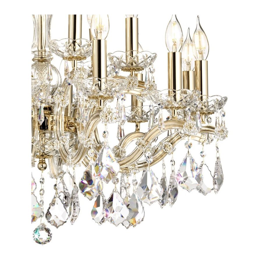 Mariateresa chandelier with soft gold metal frame covered by transparent glass arms and transparent Asfour® Crystal pendants. Lighting item that diffuses the light with great effect in the surrounding environement creating a warm and welcoming atmosphere.