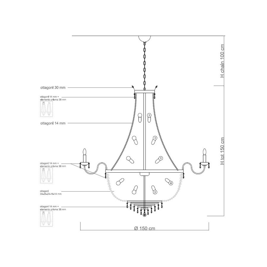 Bulbs: 16xE14xLed + 18xE14XLed| Wymiary (wys. x szer. x gł.): | cm: 150x150 / inch: 59.06"x59.06" |