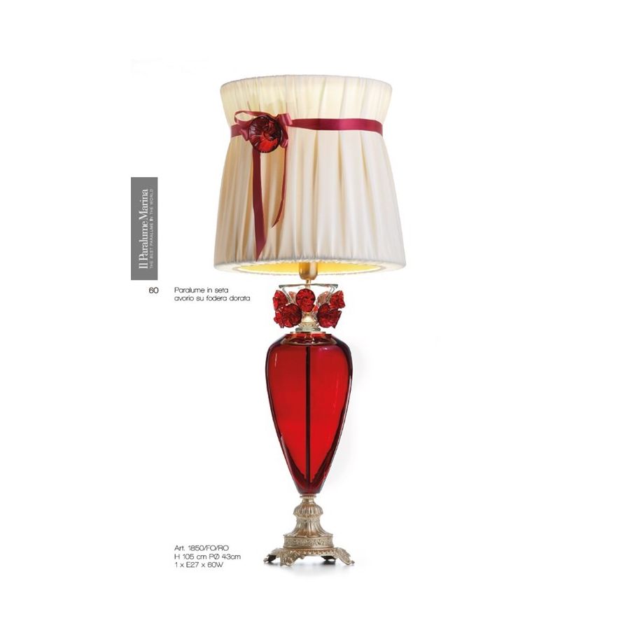 Table lamp in red Florentine crystal and cast brass. Decorated with red Murano glass flowers and lampshade in double fabric with silk ribbon and glass flower. Lighting item that diffuses the light with great effect in the surrounding environement creating a warm and welcoming atmosphere.
