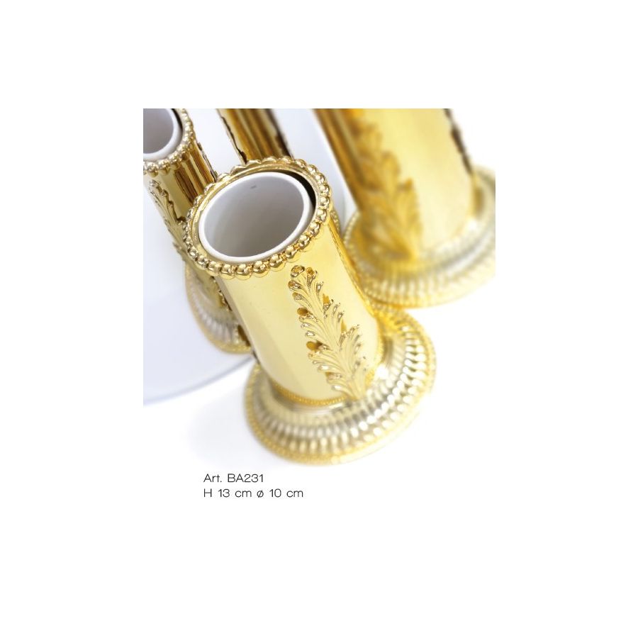 Toothbrush holder in brass finishing gold 24k with pvc glass inside. Functional elements that create an extremely elegant, welcoming and high-value bathroom.
