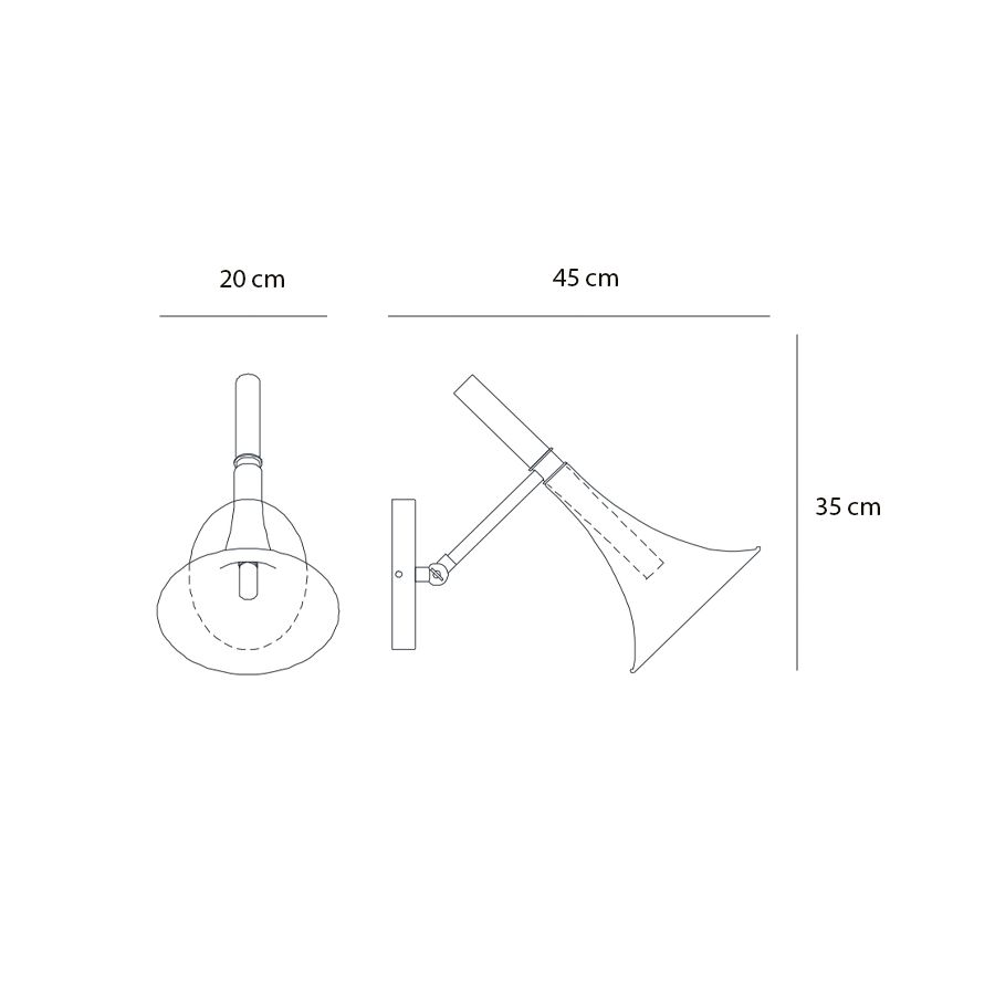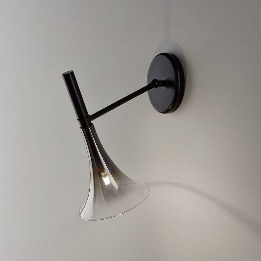 Adjustable wall lamp with titanium or gold shiny coated blown glass. Metal structure mathced with the glass colour.