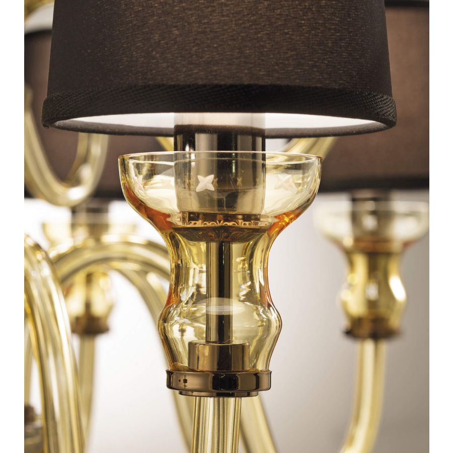 Chandelier in amber carved crystal, metal with gold nickel finish and black fabric shades. Available in different dimensions and colours.