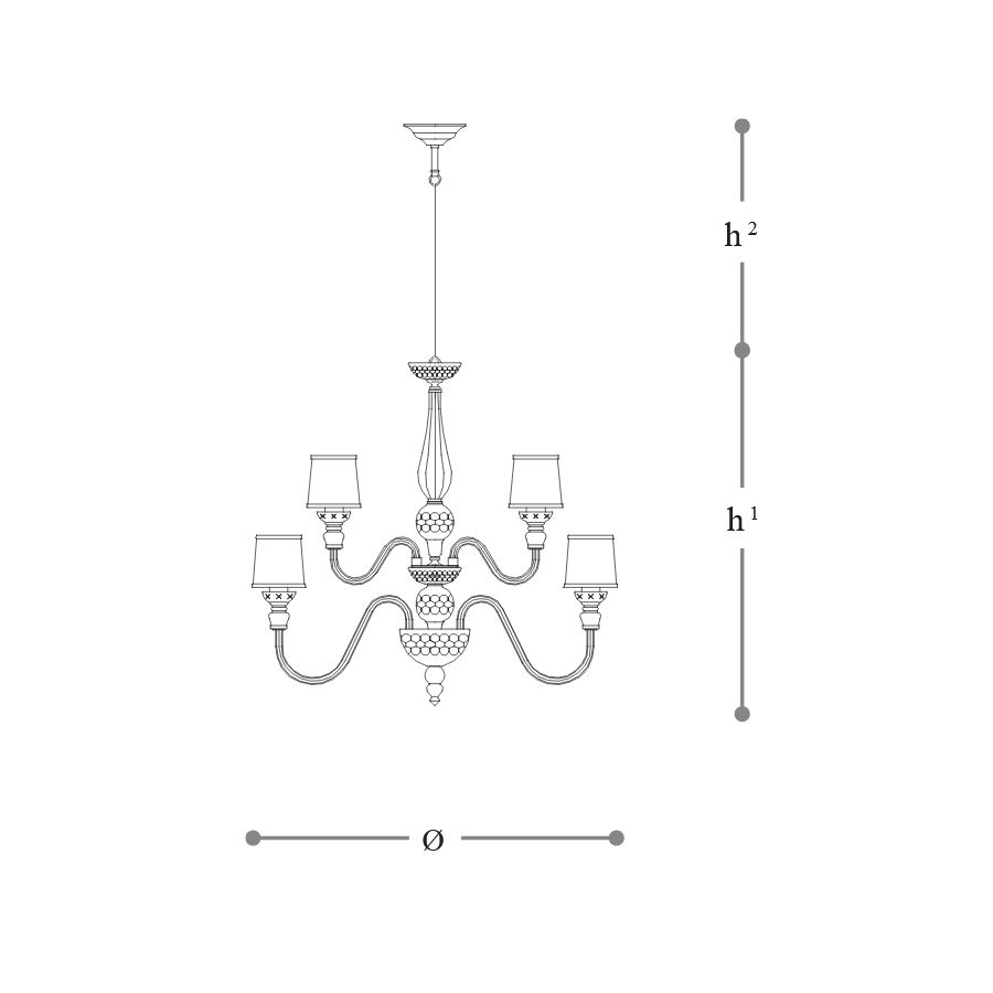 225 chandelier is able to transform any environment into a welcoming space. Made of amber carved crystal, metal frame and black or ivory shades that give off a warm and soft light.