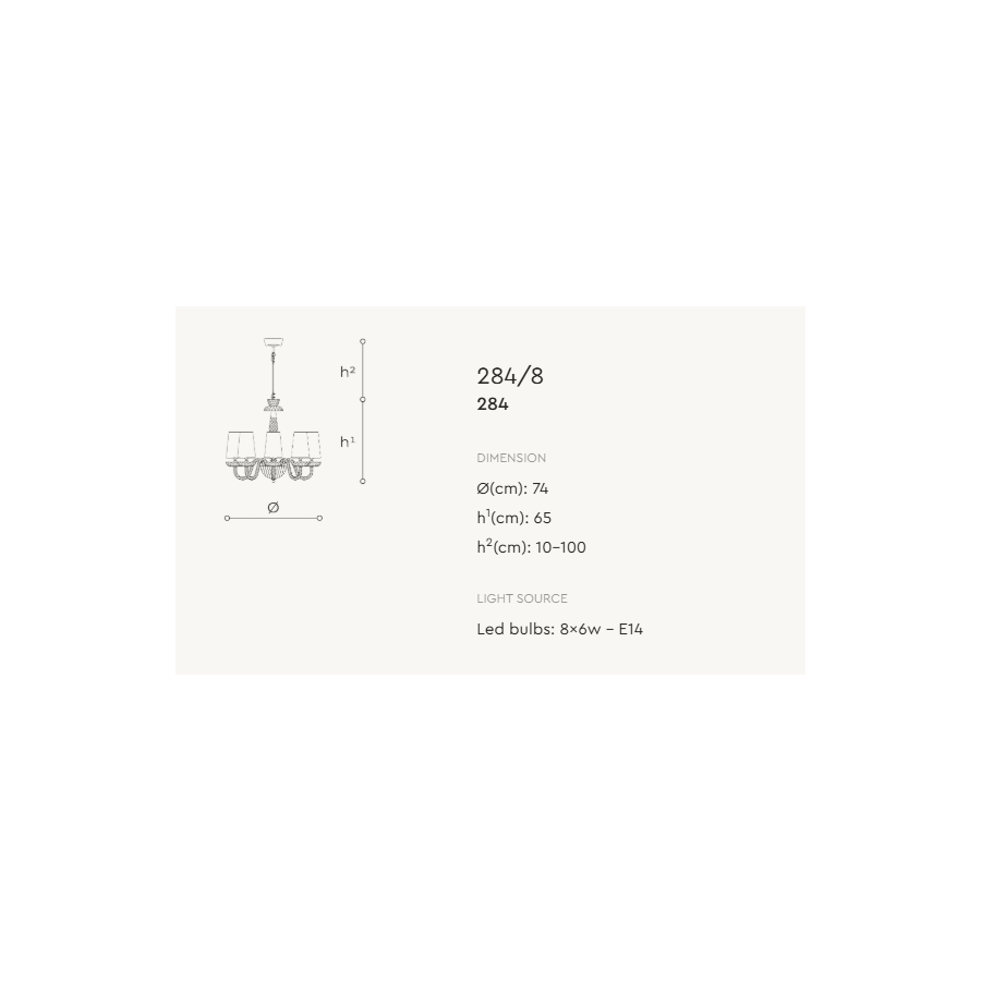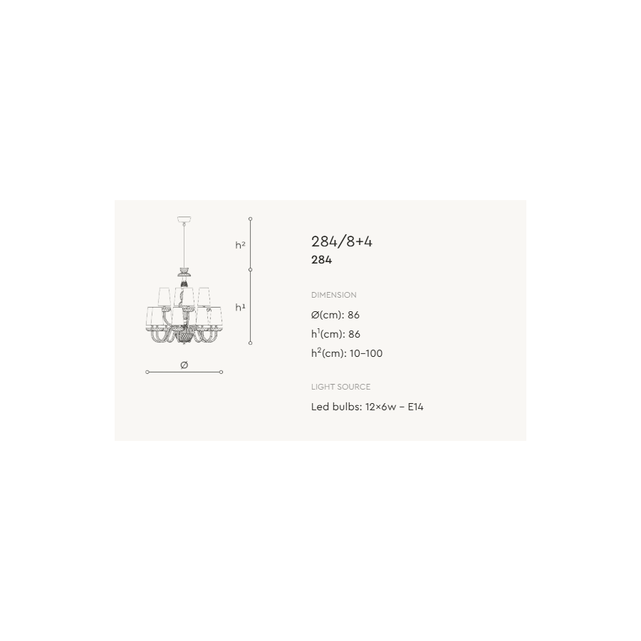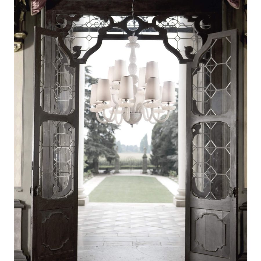 Chandelier in white, transparent or black carved crystal, metal with nickel or iron grey finish, black or white fabric diffusers.