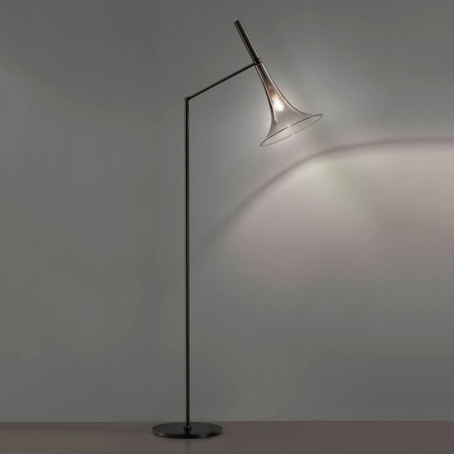 Floor lamp in metal with matt black finish. Blown glass diffuser with faded titanium metal finish. Available in different colours.