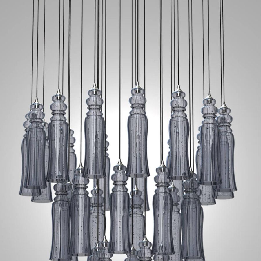 Pendant lamp compossed of blown striped glass diffusers in transparent and fume smoked colours. Metal structure with chrome finish.