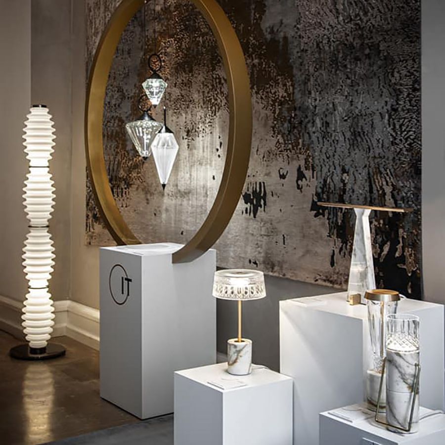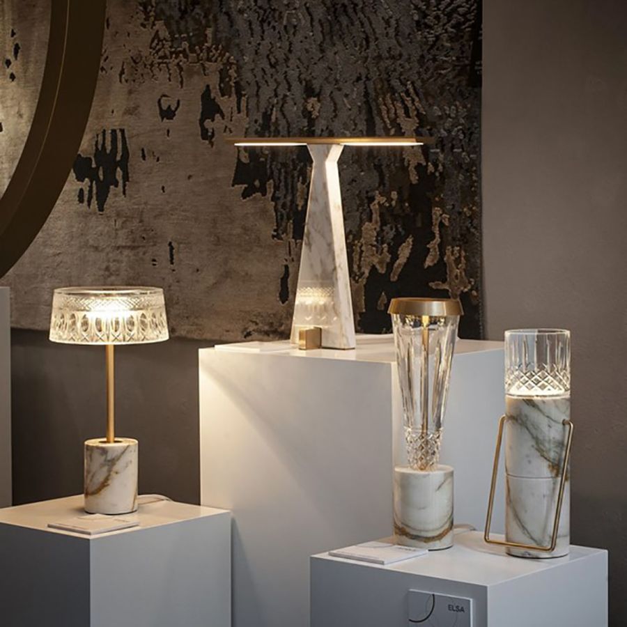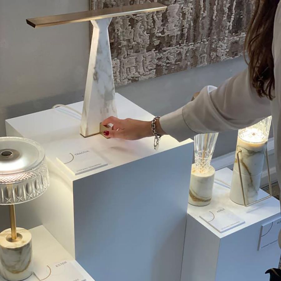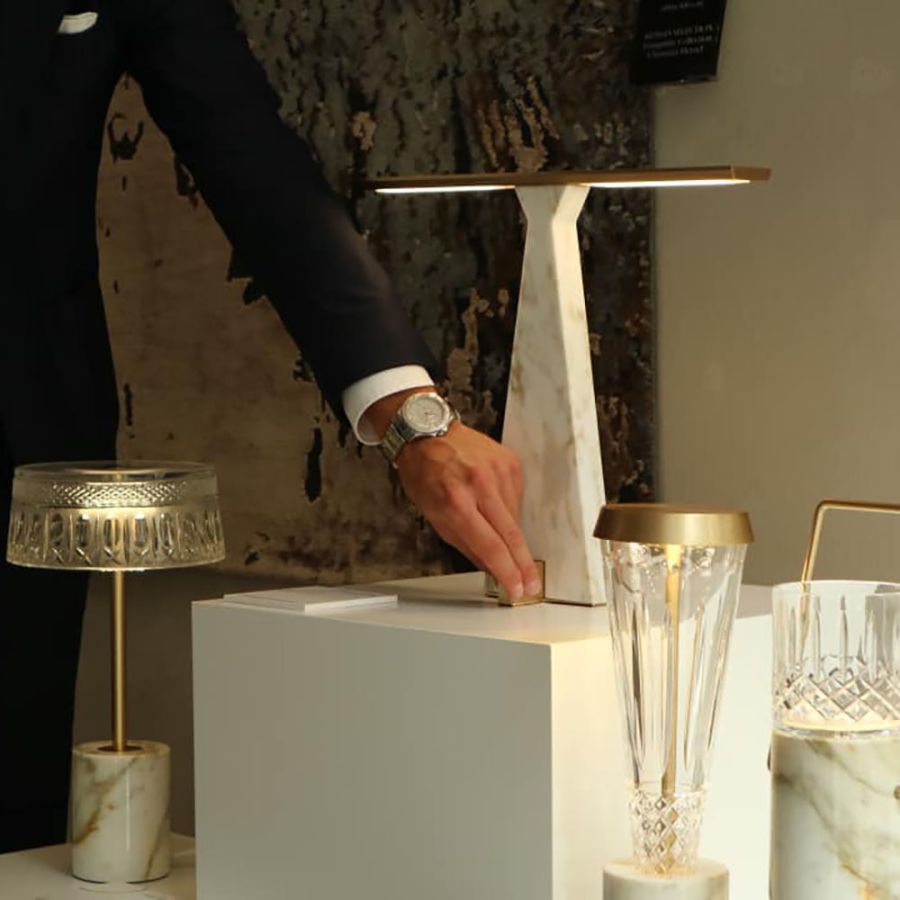 Traccia is the table lamp with casts geometric shapes. The linear light source illuminates the elegant and precious gold calacatta marble base providing the space with energy and character.
