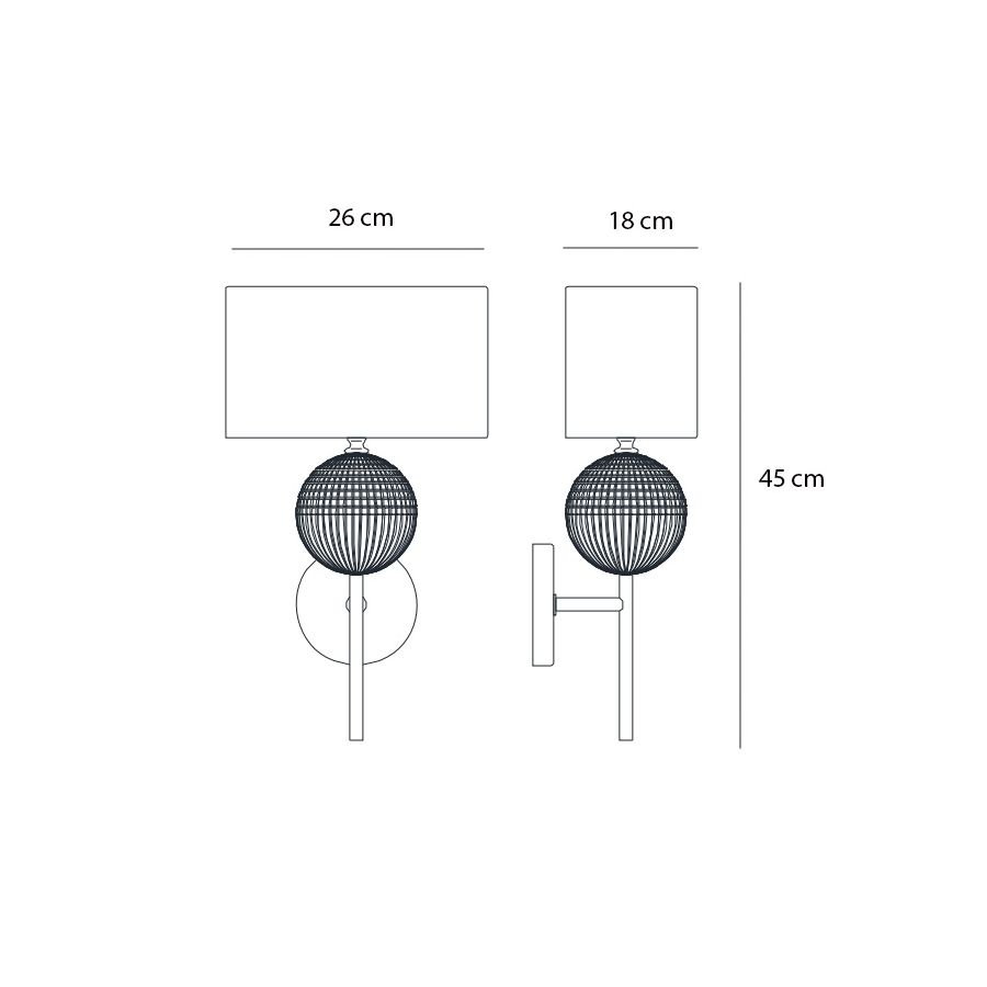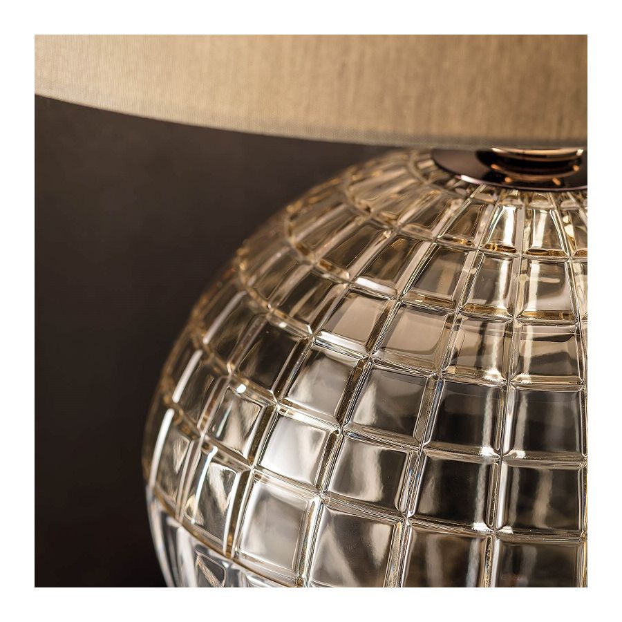 Brigitta is a collection of table and wall lamps with an elegant and contemporary design. It is characterized by a metal structure enhanced by a crystal ball carved by hand transparent and teak, while the fabric diffuser is available in dove grey color.