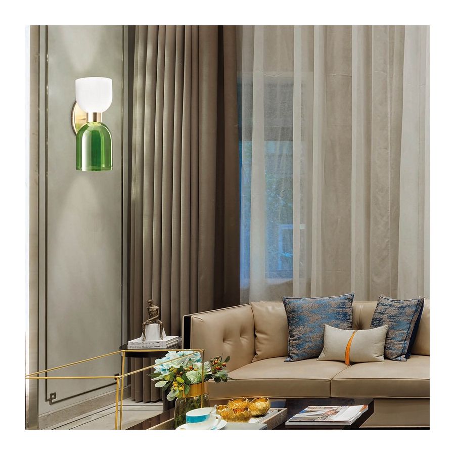 Wall lamp in metal brushed gold finish with opal white and green glass diffusers.