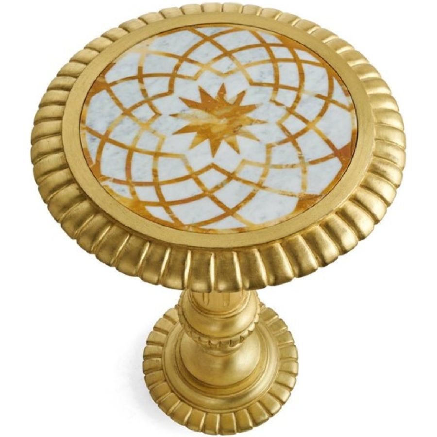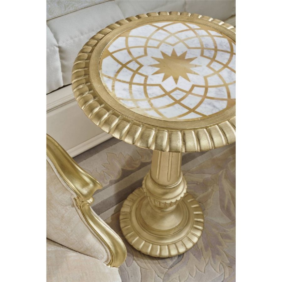 Arabesque is a precious coffee table with a classic decorative spirit, characterized by a marble top with an ornamental motif created by water-jet processing, and a structure with hand-carved details with a gold leaf finish. A sophisticated piece of furniture, perfect for creating corners with a suggestive charm in the living area.