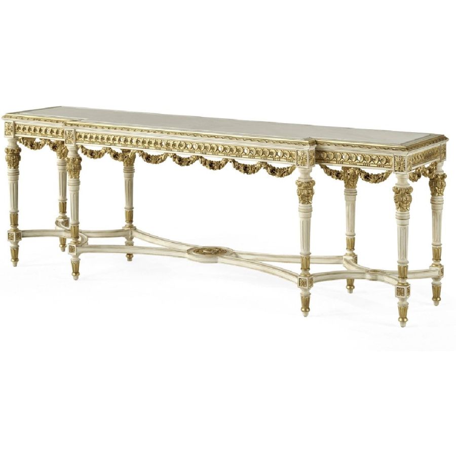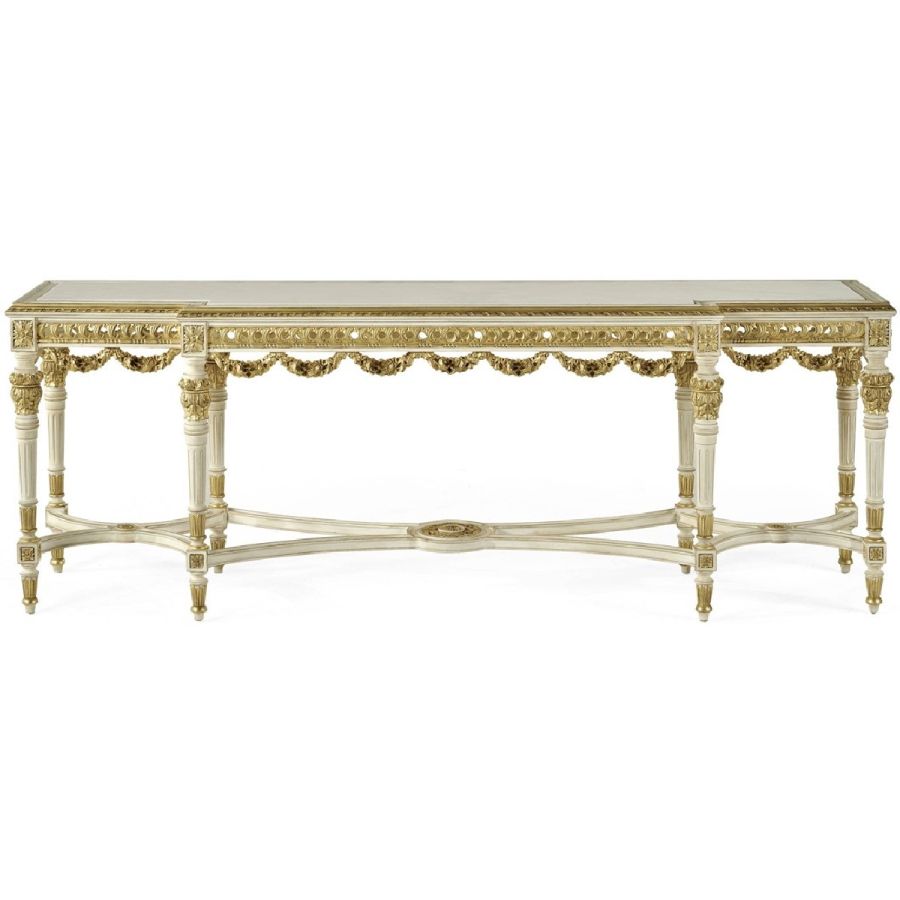 An emblem of artisanal excellence, the Guirlande console enchants with its rich garlands and slender columns, highlighted by luminous gold accents. The console rests on eight carved legs connected by a cross structure, finished in patinated white lacquer. The top in marble completes the piece, offering a harmonious blend of classical inspiration and eclectic aesthetic.