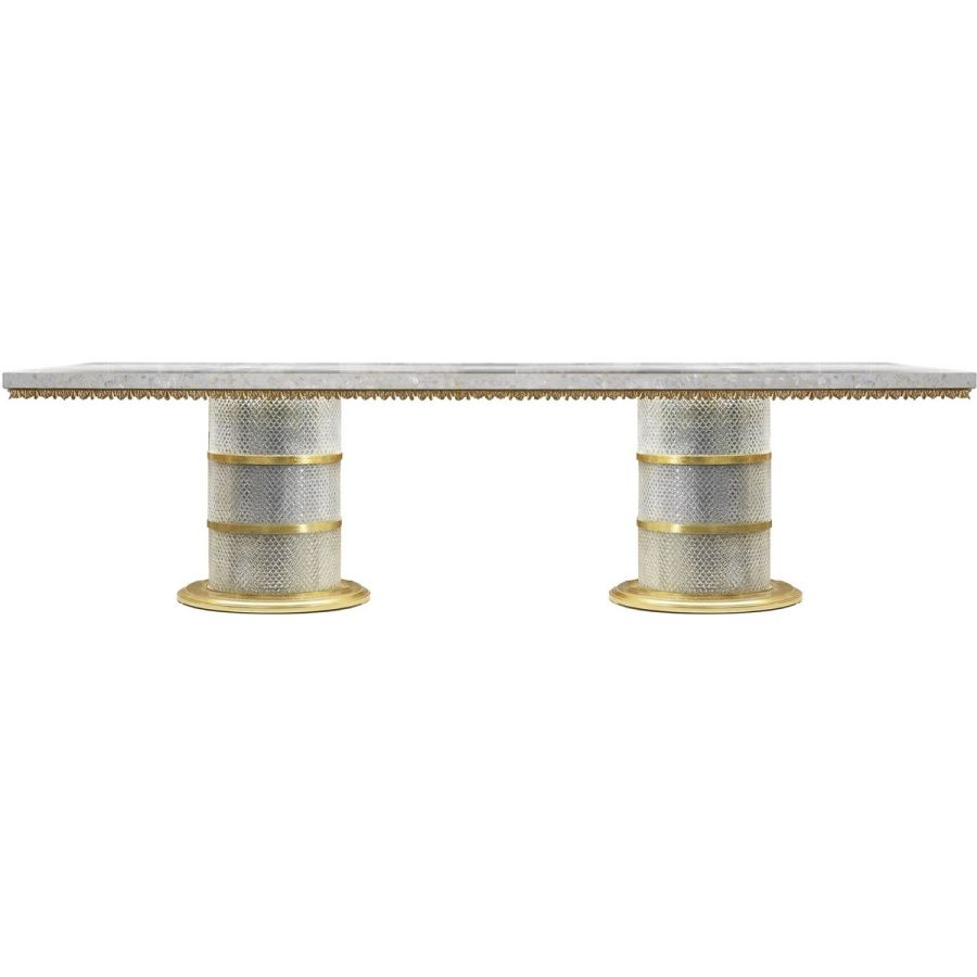 A refined combination of styles and precious materials gives life to a table with a great visual impact. Coquille is characterized by a base with a glossy gold finish with cut glass columns with led lighting. The top is in mother of pearl with refined hand-made gold inlays. The result is a scenographic table suitable for settings with a classic and luxurious charm.