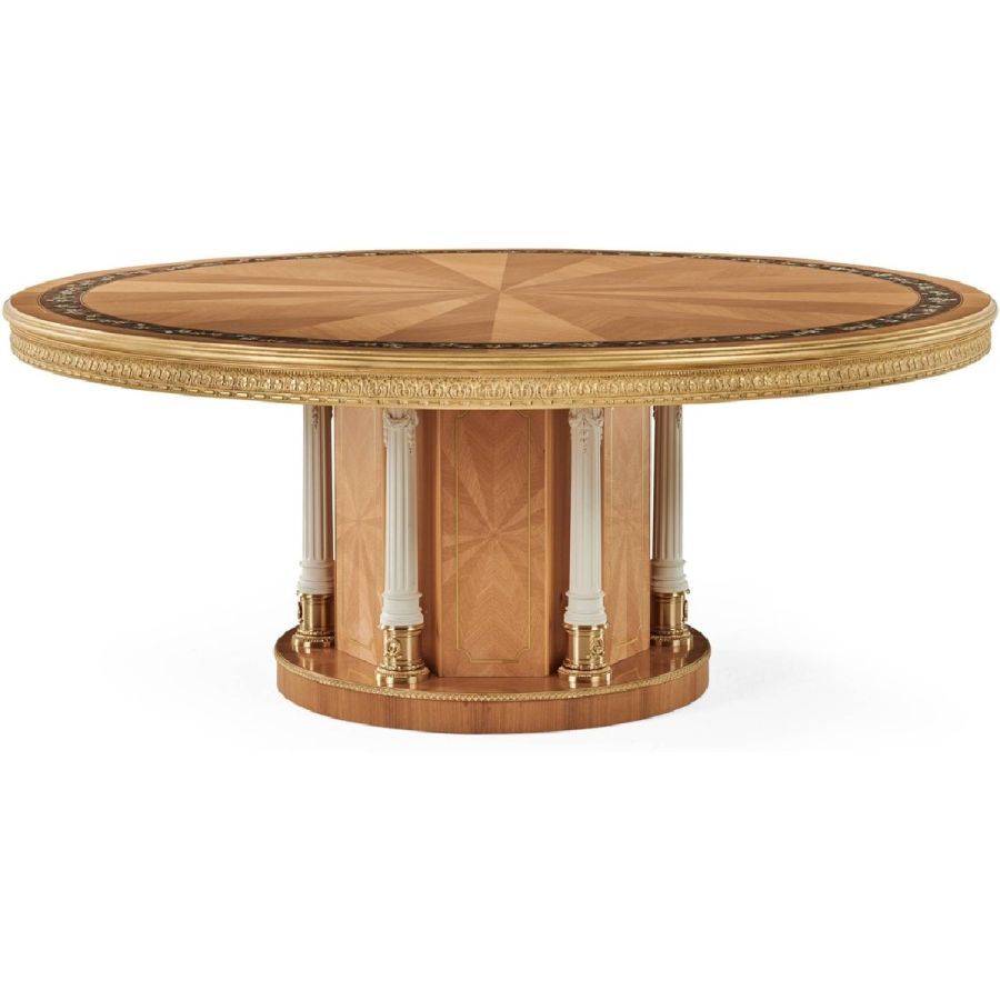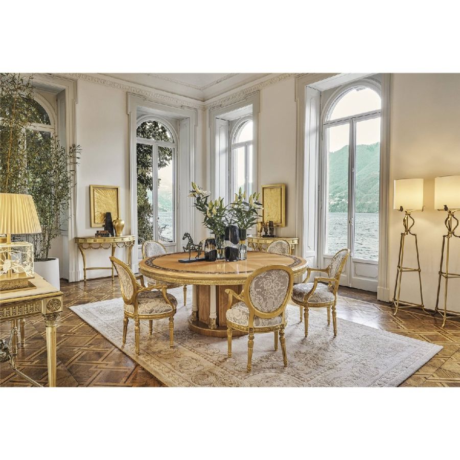 Majestic and refined, Floral dining table features a base veneered in Tanganika with intricate brass inlays and neoclassical wooden columns with a white lacquer finish and cast brass details. The ray-of-sunshine top is adorned with a walnut inlaid border and hand-painted decorations. Precious, sophisticated and meticulously crafted in every detail, Floral is designed to become the showpiece in any dining room.