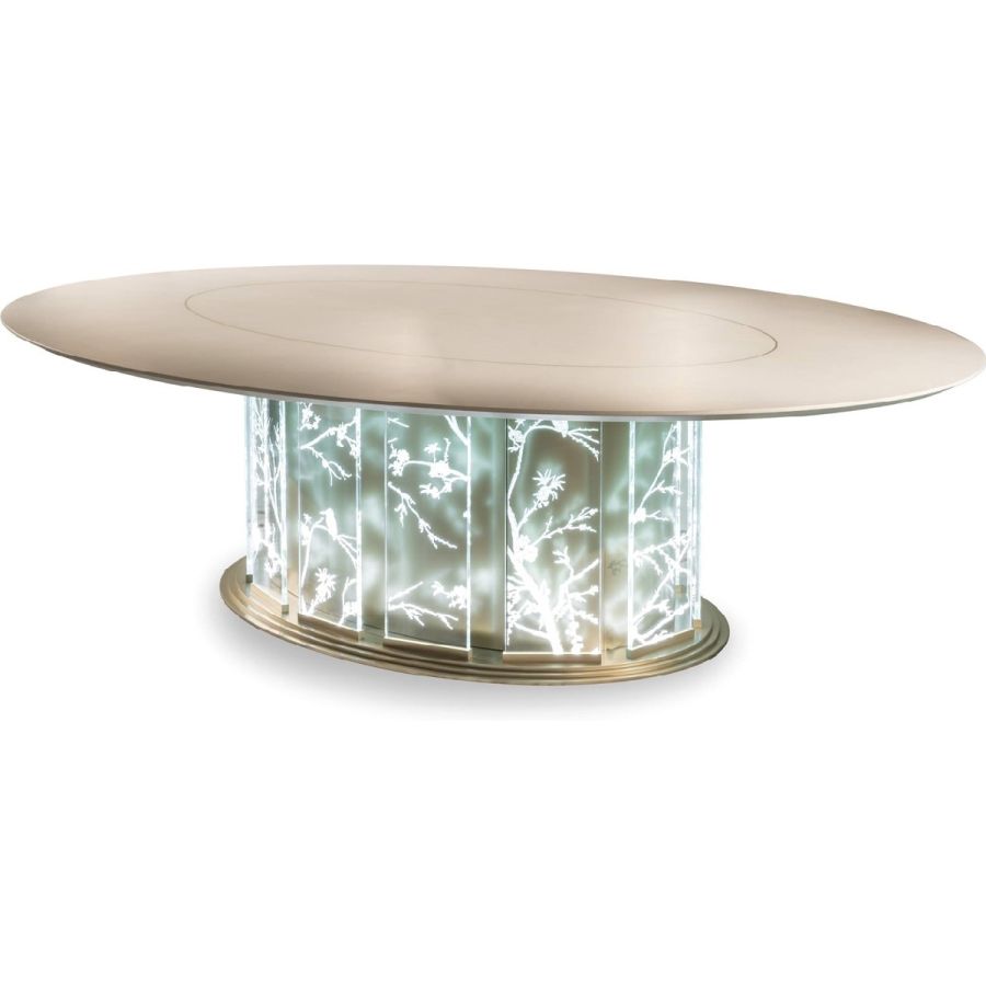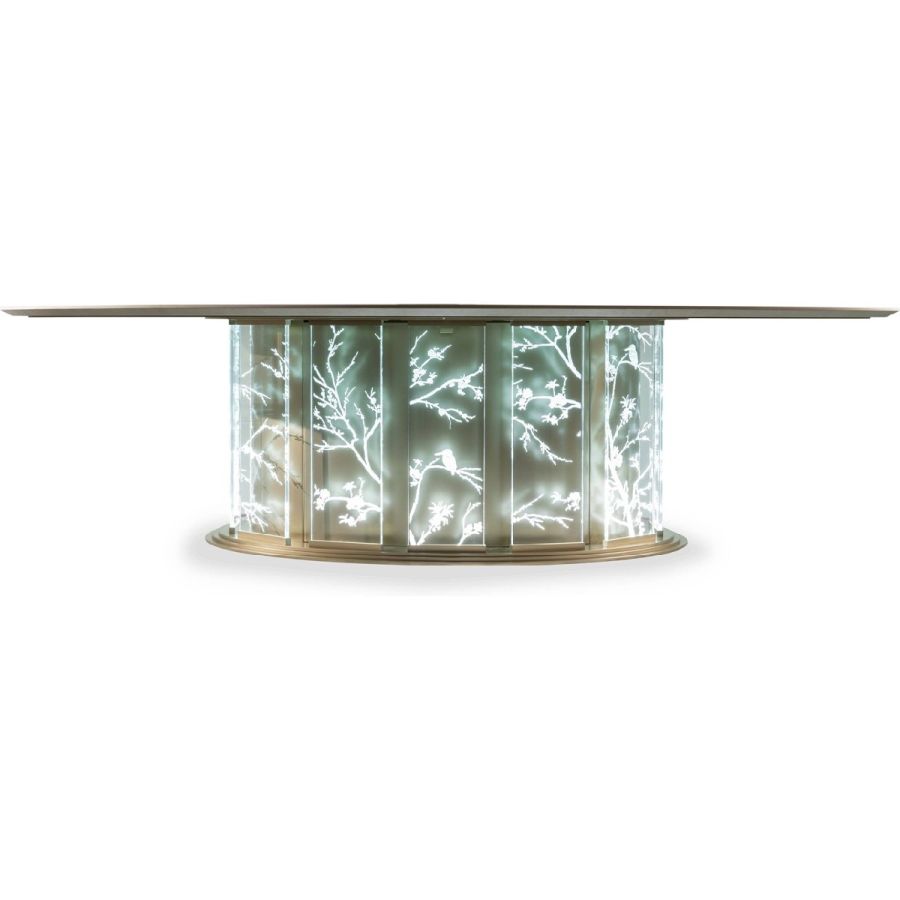 A scenographic dining table that demonstrates Jumbo Collections technical and artistic skills. The special manufacturing of the glass, engraved in several steps and with different depths, gives a three-dimensional effect to the drawings, studied ad hoc on the piece. The lighting takes place through the thickness of the glass and allows the engraved elements to be highlighted: bamboo, herons, peach blossoms and other elements inspired by the Orient.