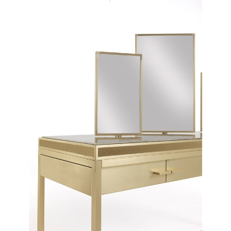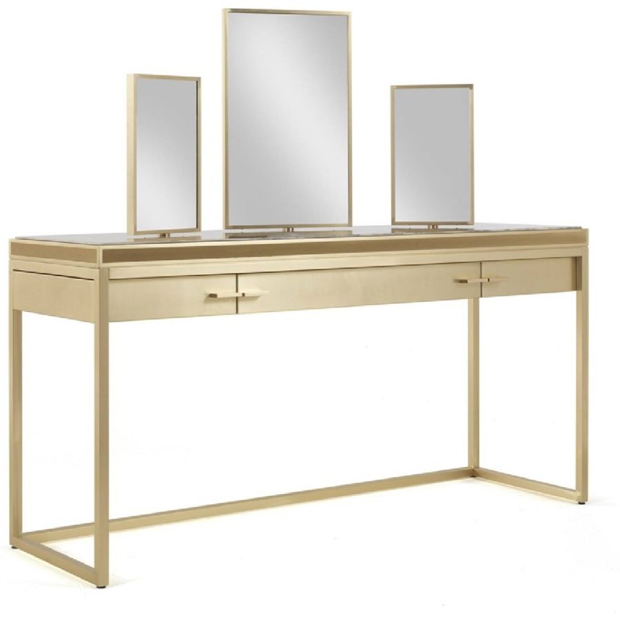Boasting clean lines and a simple yet luminous classic style, the Dedalus dressing table exudes timeless elegance. Its structure is crafted from satin brass and features three drawers, along with a top adorned with grey onyx. Completing its sleek design are three fully functional rotating mirrors with satin brass frames, adding a touch of sophistication.