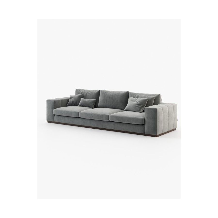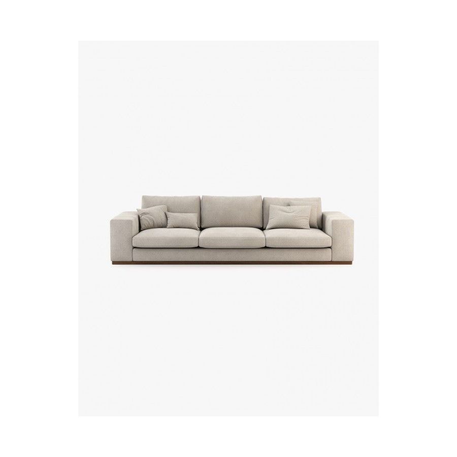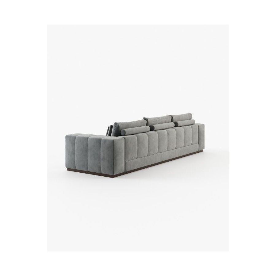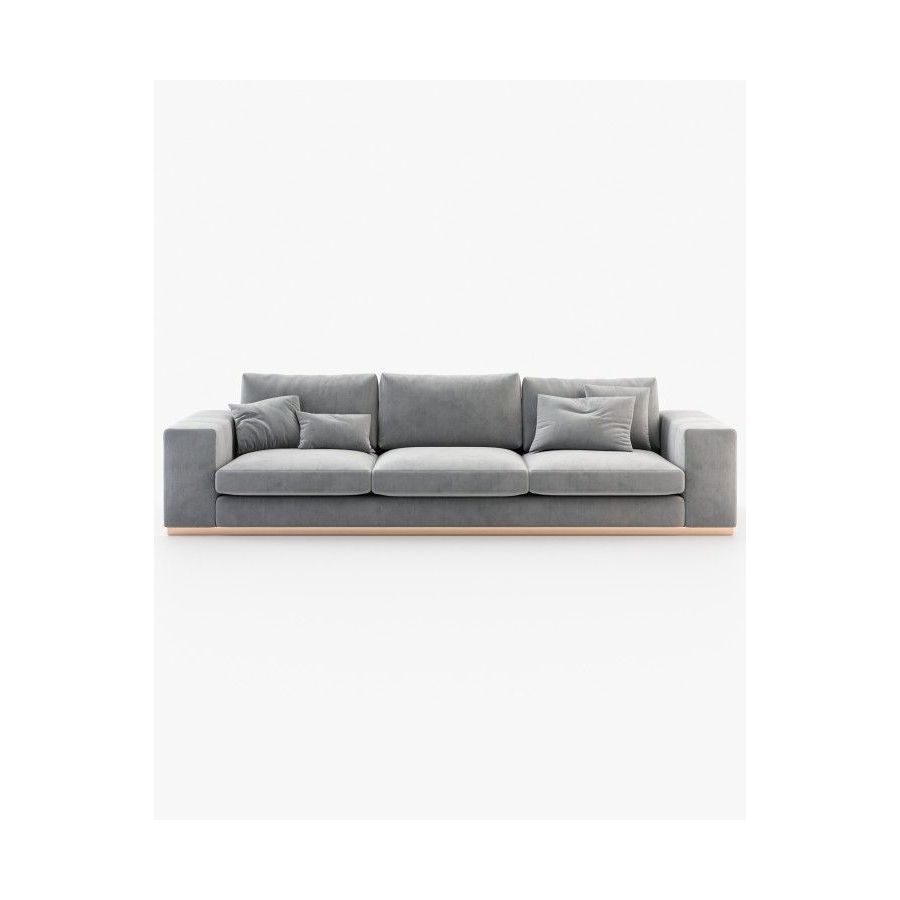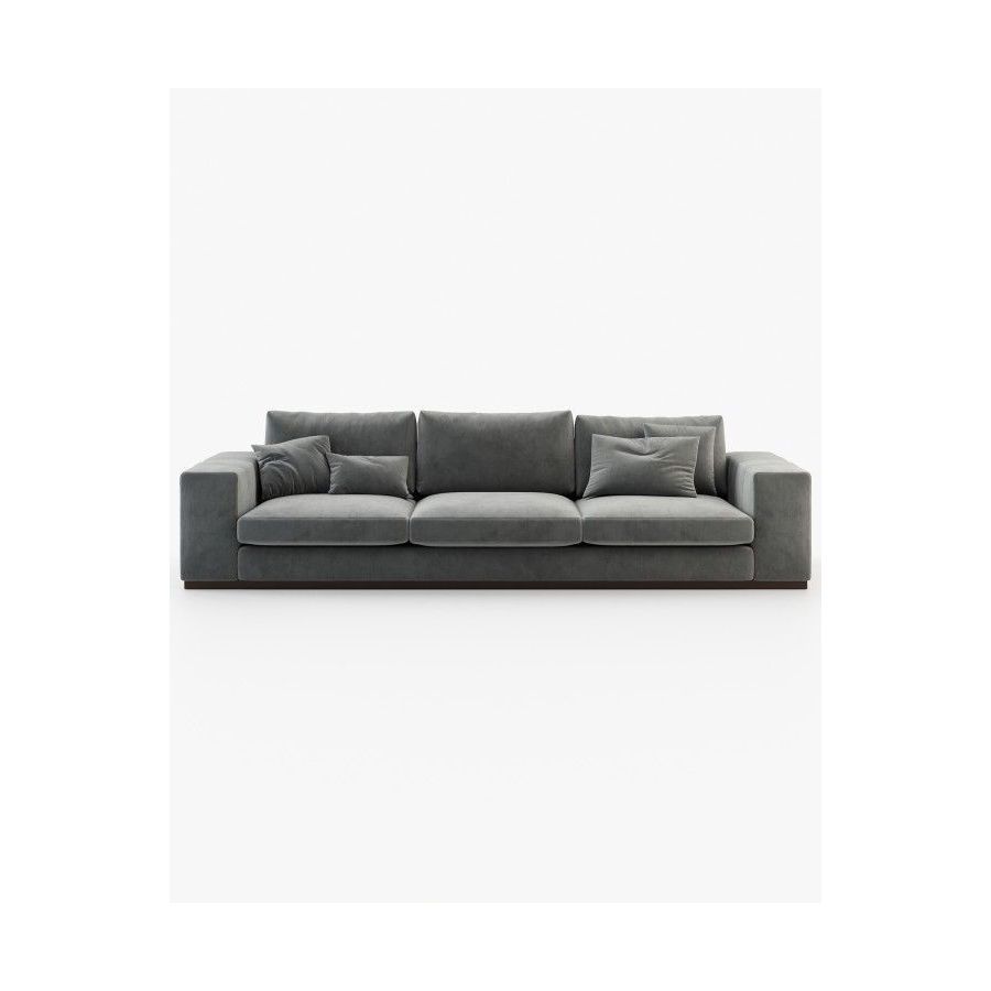 The Charlie sofa is a contemporary and comfortable piece designed for peaceful living rooms, featuring a sleek metal base and wide arms, available with chaise-longue and in two or three-seater options.