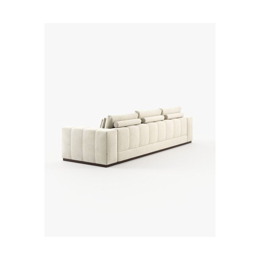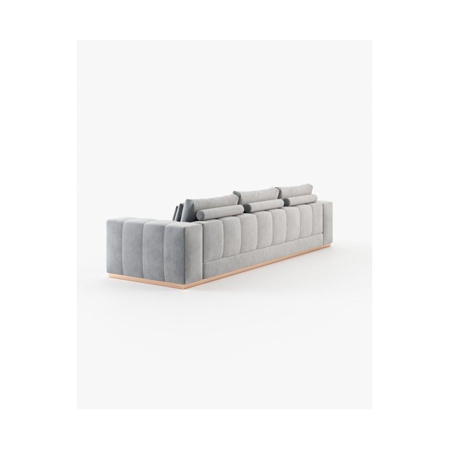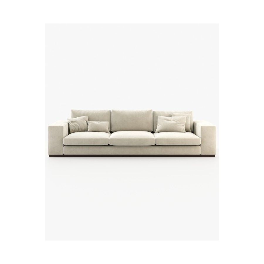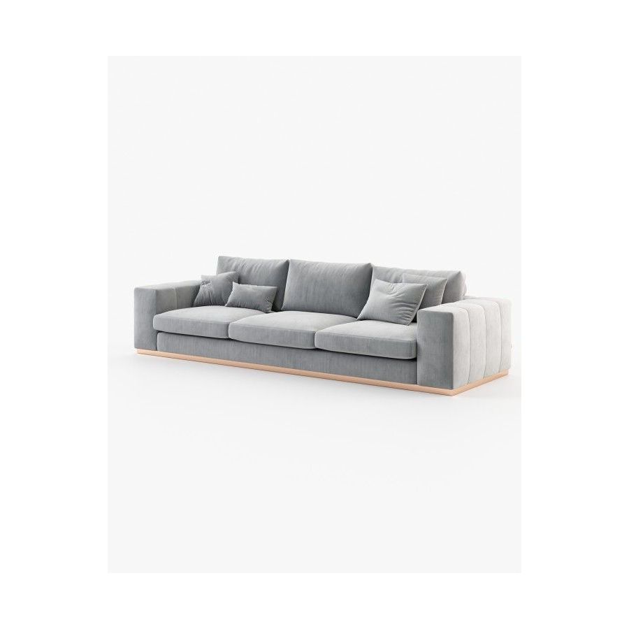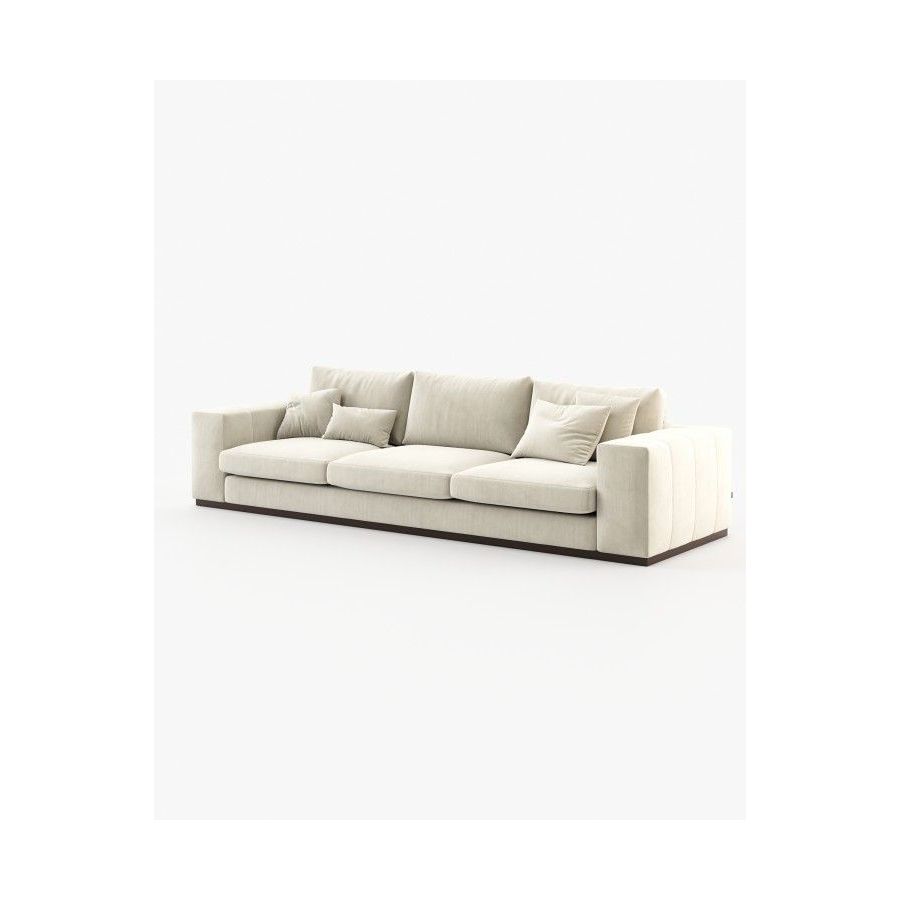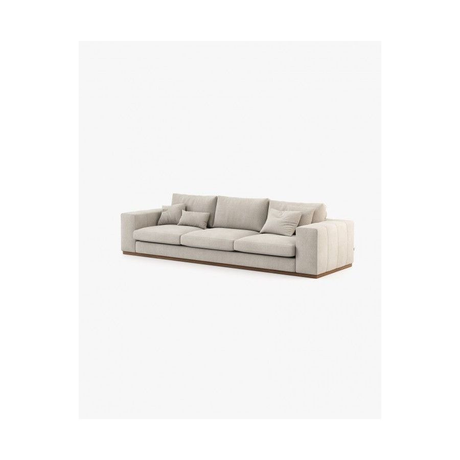 The Charlie sofa is a contemporary and comfortable piece designed for peaceful living rooms, featuring a sleek metal base and wide arms, available with chaise-longue and in two or three-seater options.