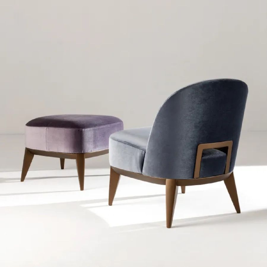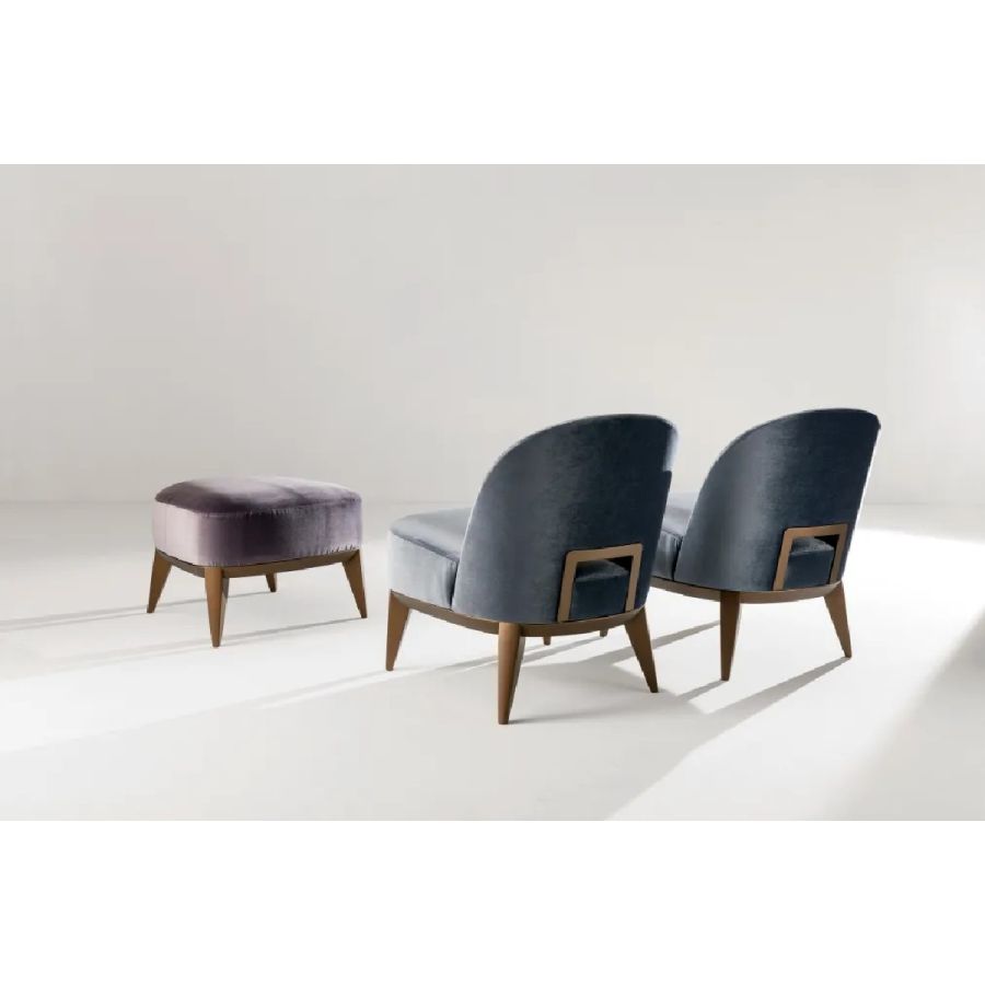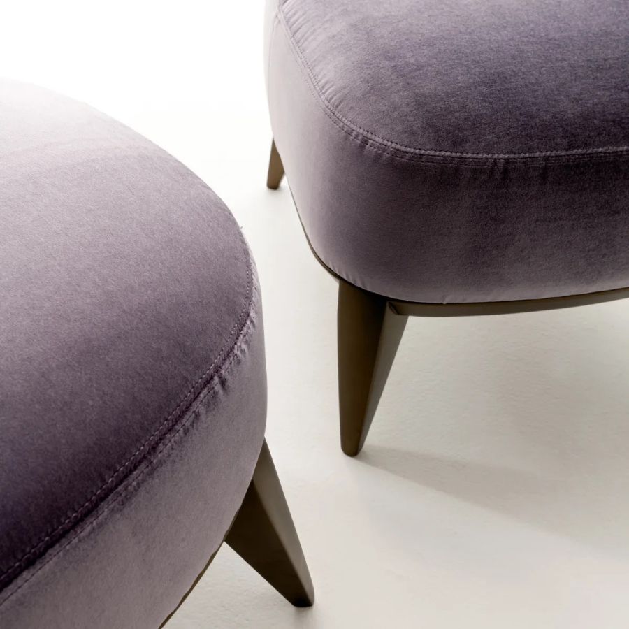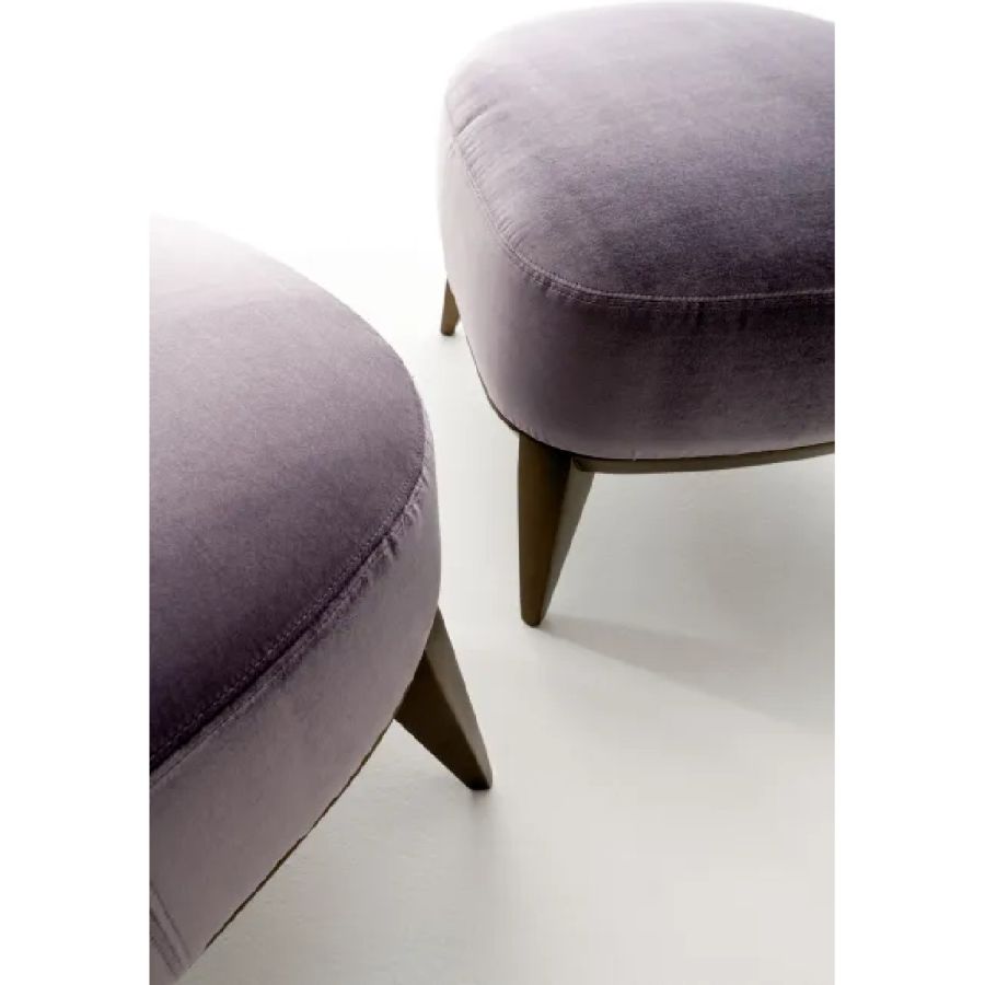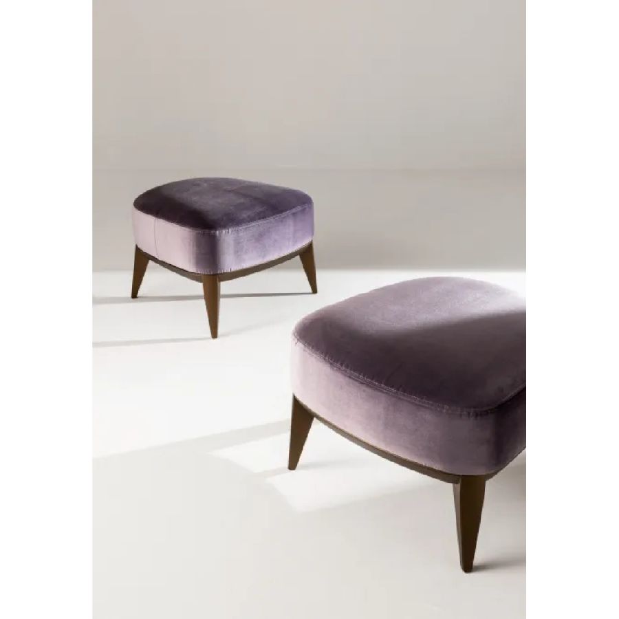 Padded pouf with wooden structure and seat in expanded polyurethane covered in leather, velvet or fabric.