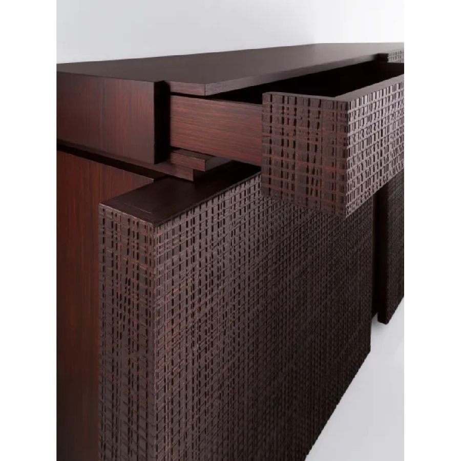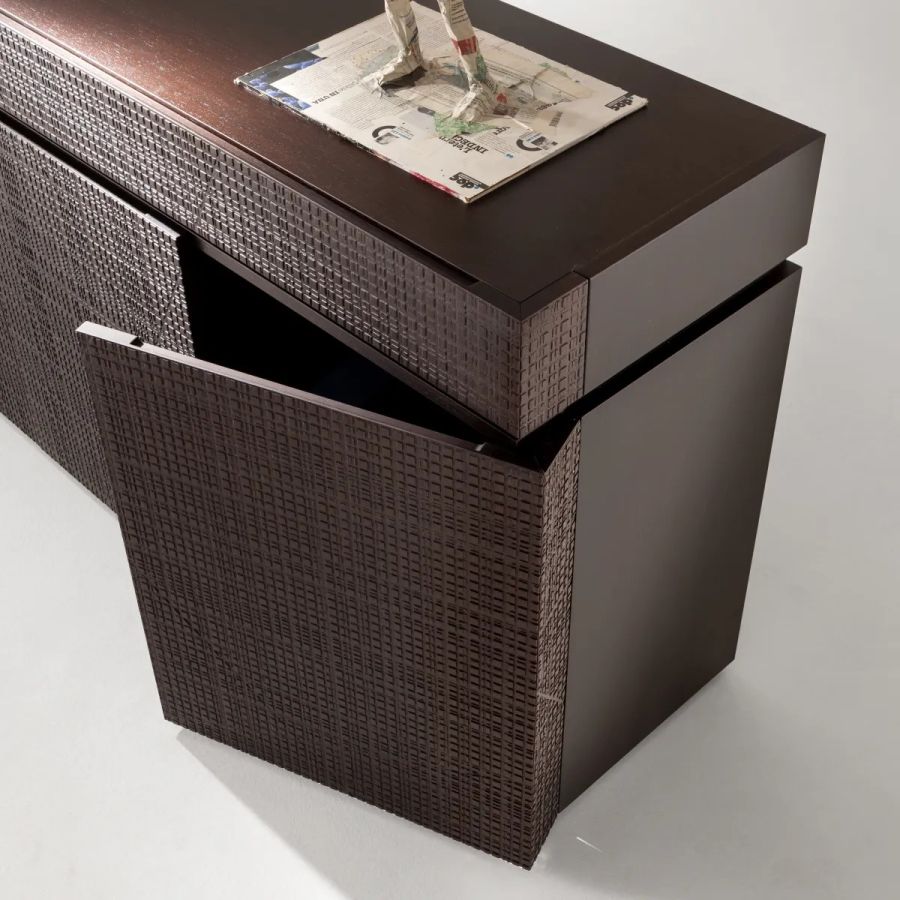 Sideboard with wooden structure and Maxima sculpted front. Interior, sides and top in plain wood. Equipped with hinged or sliding doors and drawers.