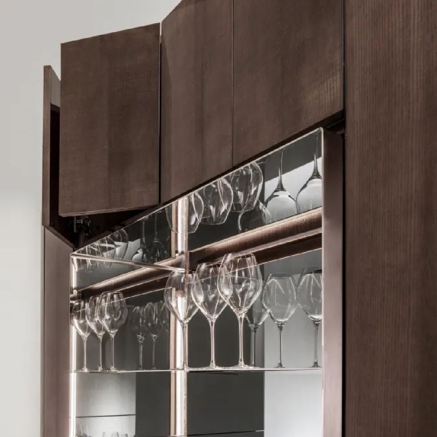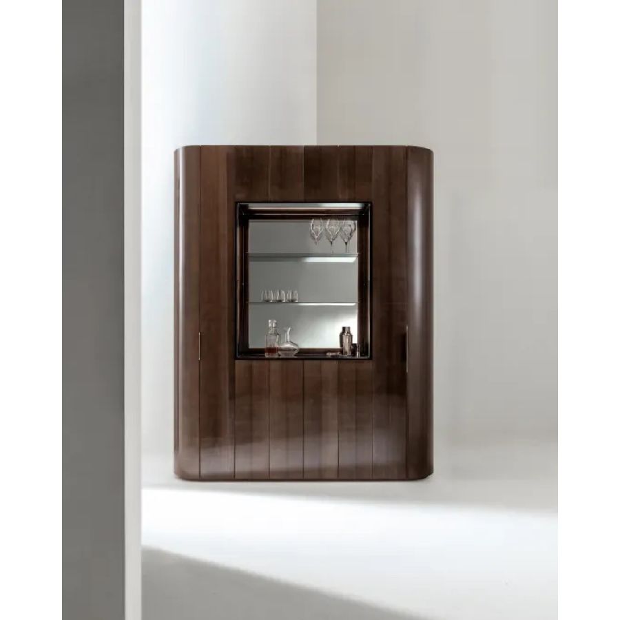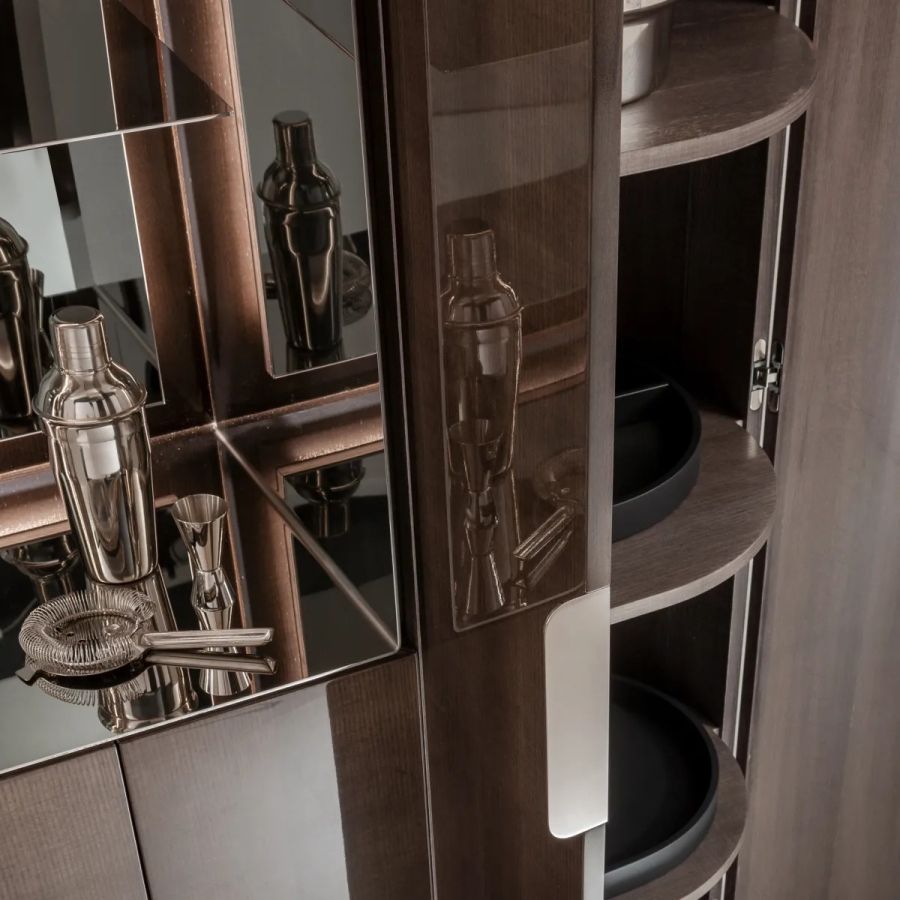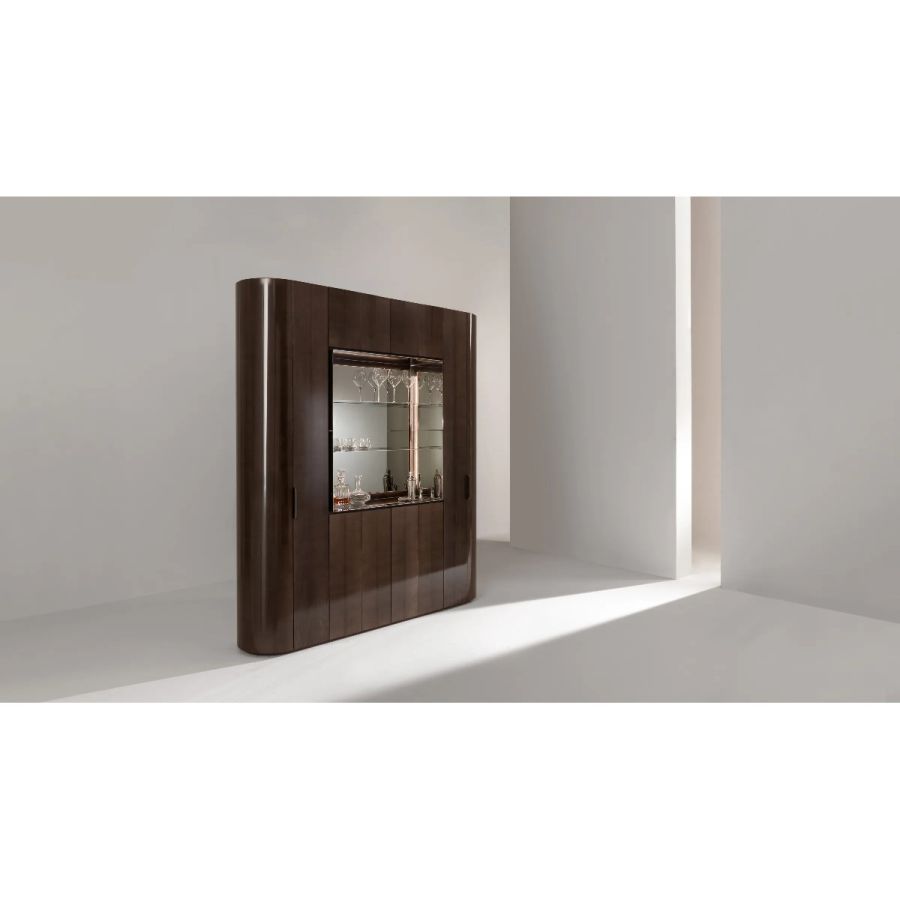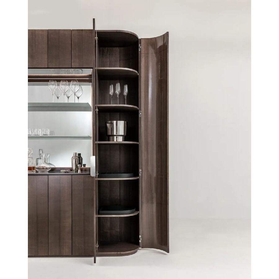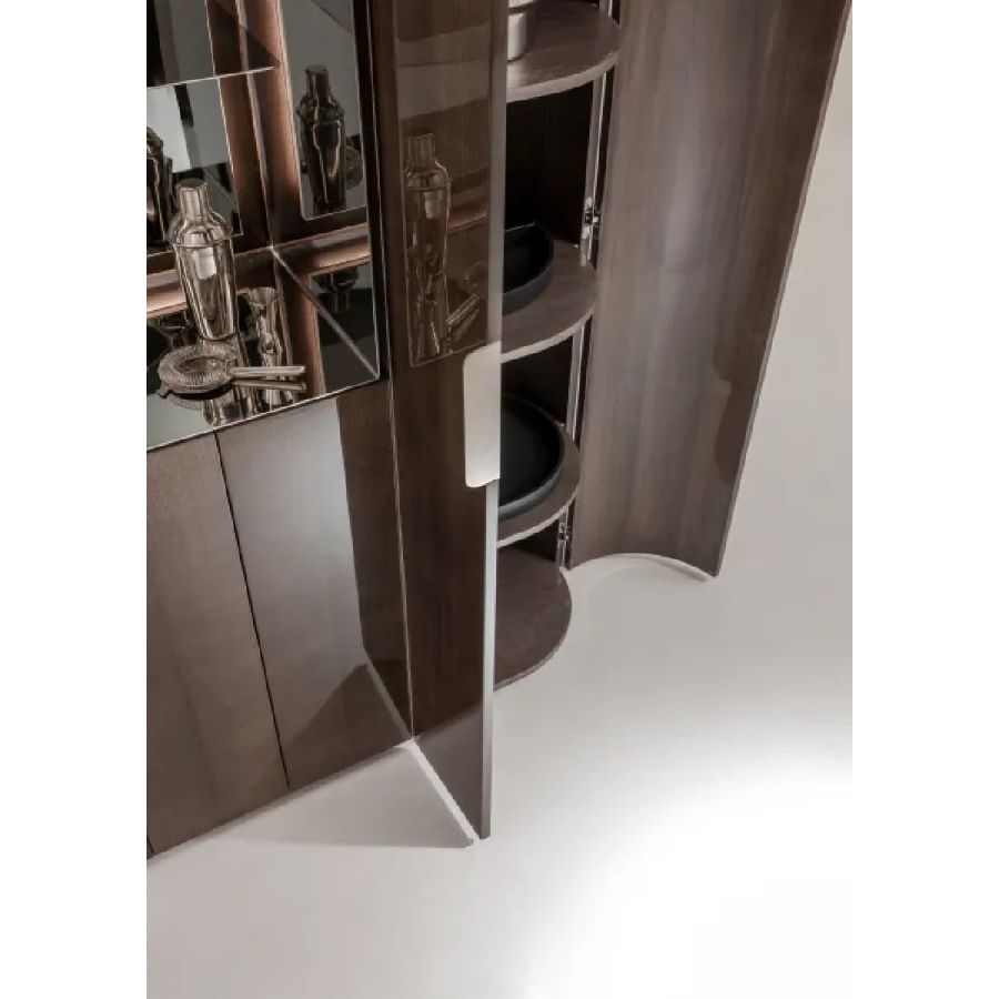 Tall storage unit with 12 hinged doors and curved sides. Wooden structure finished on all sides. Equipped with internal shelves and drawers. Open compartment lined with polished steel, featuring a mirrored back panel and glass shelves.