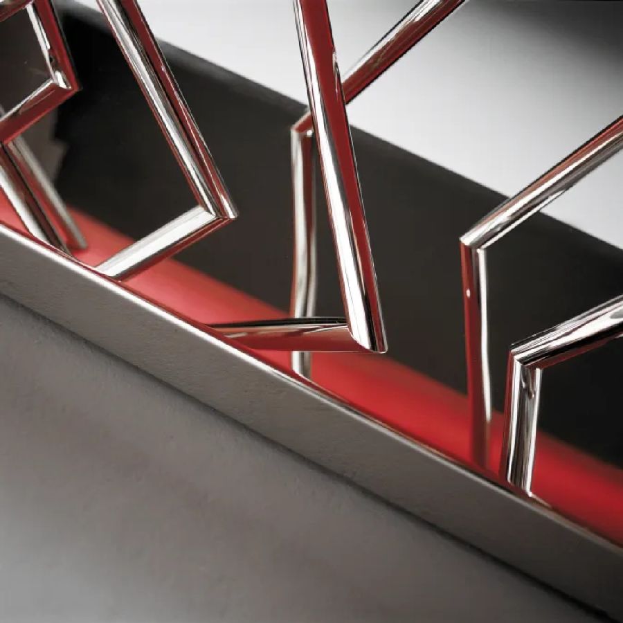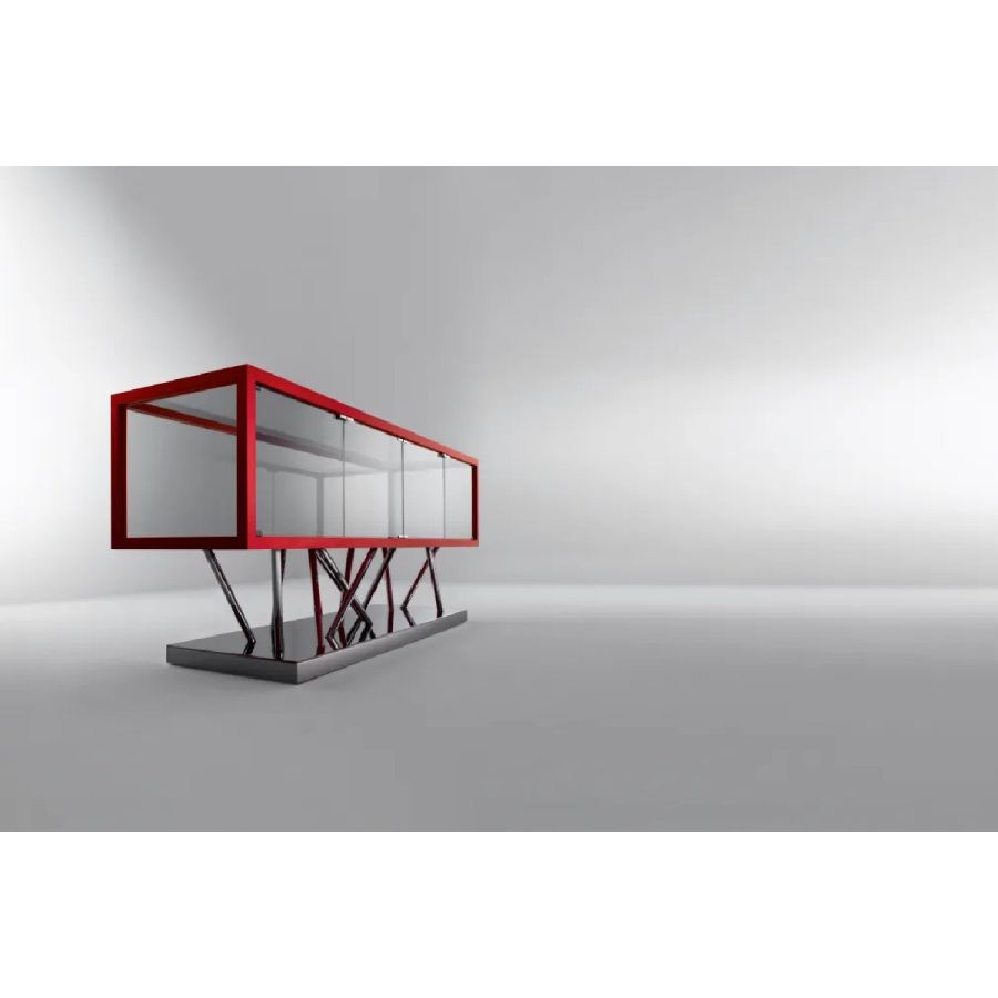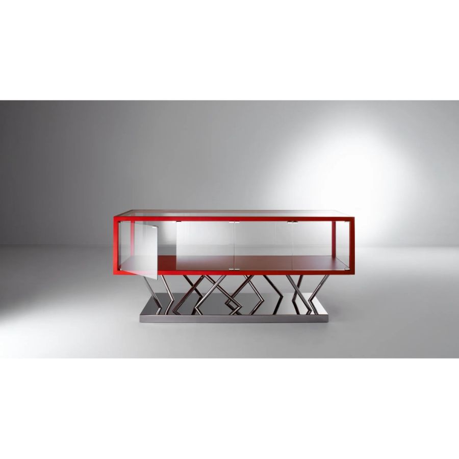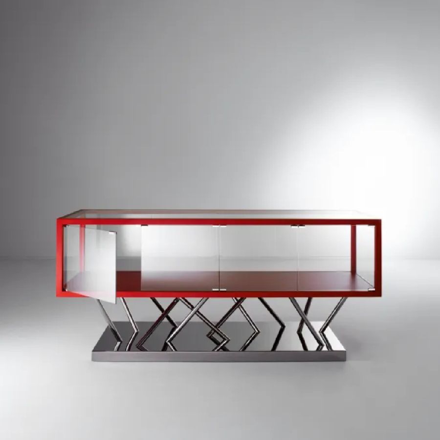 Sideboard with steel base, structure in red aniline-dyed maple; top, sides and hinged doors in extra-clear glass.