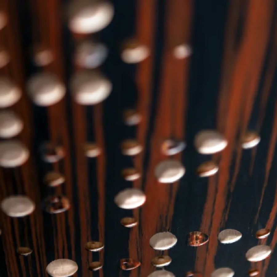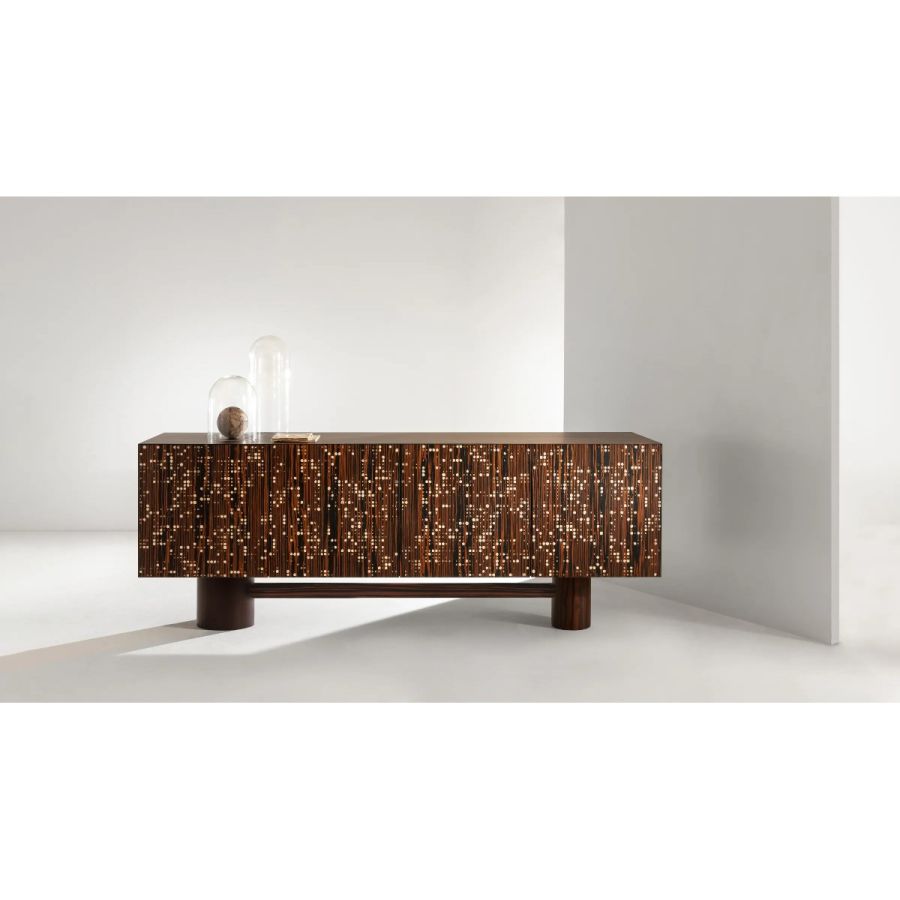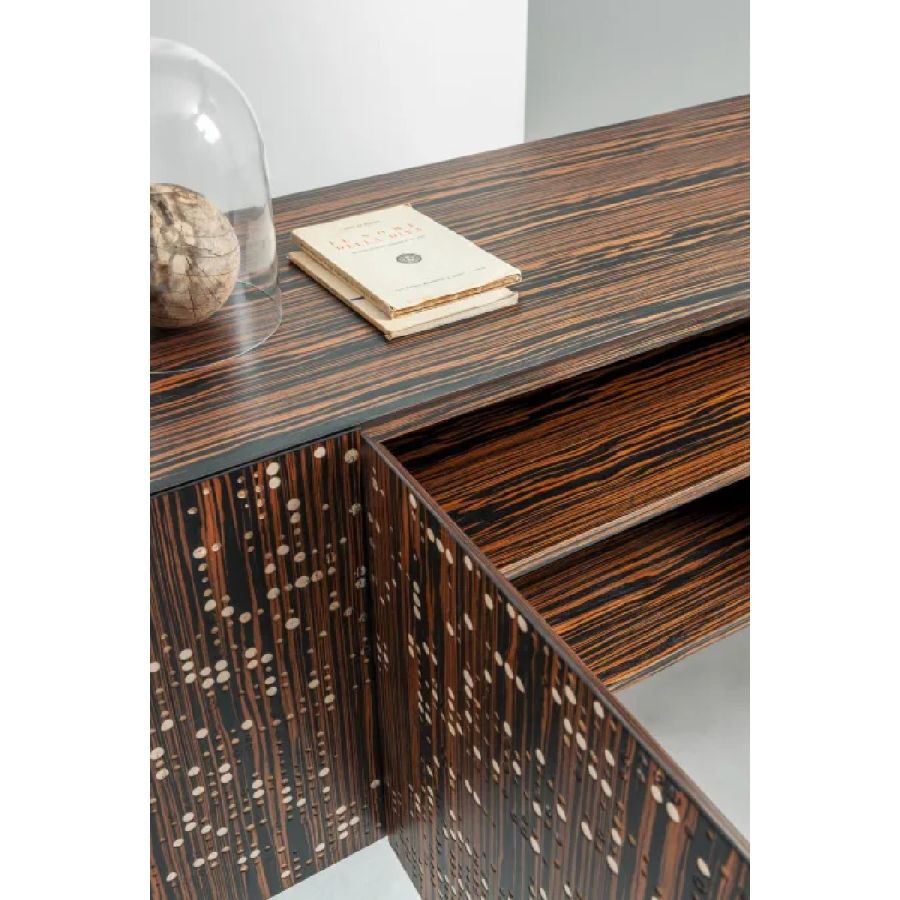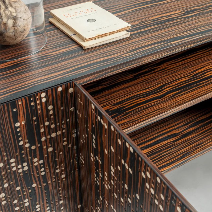 Wooden sideboard with doors decorated with overlapping walnut, ebony and maple veneers carved Unlimited. Top, sides and interior in ebony.