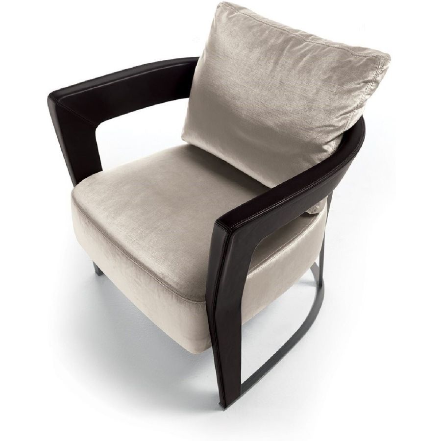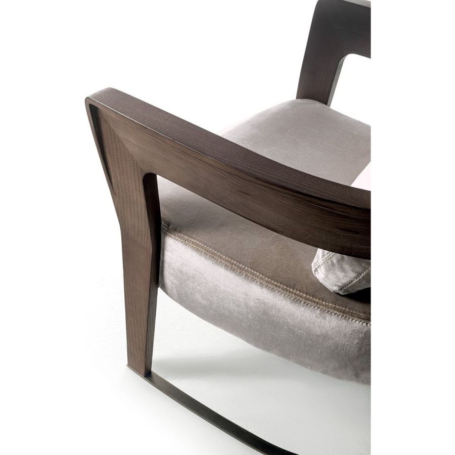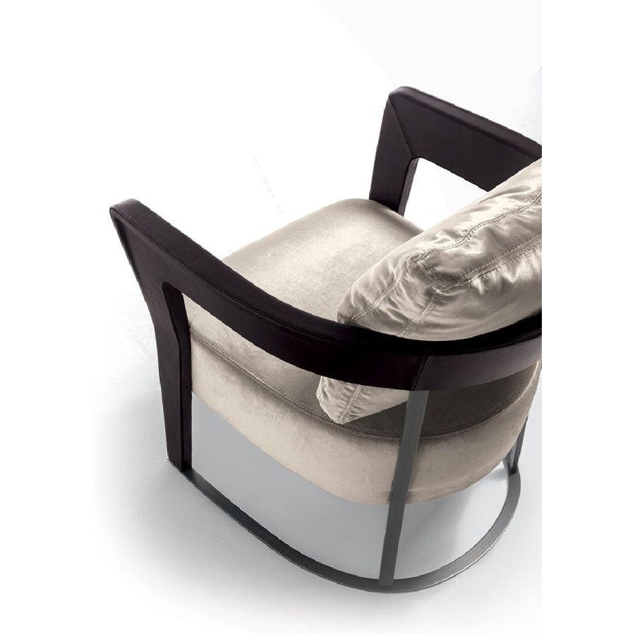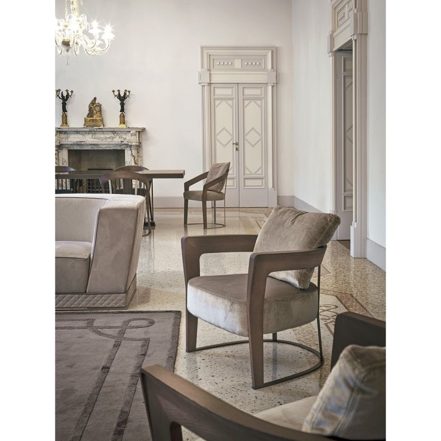 This elegant chair recalls those from the ‘40s with a solid ash wood structure and soft padding in the seat and backrest. The moulded, shaped, and curved wood of the armrests communicates a reinterpretation in modern style of shapes of yesteryear. The backrest and base supports are in metal.
