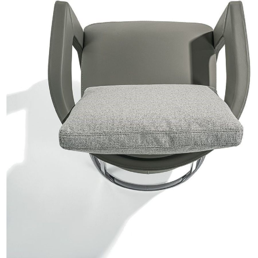 Chair in triple density polyurethane foam, with shaped Memory Foam padding to allow it to hold its shape over time. Backrest cushion in sterilised goose down with insert in soft polyurethane foam. The seat upholstery is not removable, but the backrest upholstery, in leather or fabric, is removable. The frame is in solid ash wood moulded and shaped with CNC machines. Painted with water-based colors in black, Mink brown, wengé, ebony, walnut or natural ash wood. The wood frame can be covered in leather in range colours. The base and backrest supports are in laser cut ground metal in the finishes: Satin nickel, bright shaded brown, Black Rose gold, bright light gold, matt Champagne gold, bright chrome, bright black chrome, matt satin bronze, bright pink gold, matt pink gold.