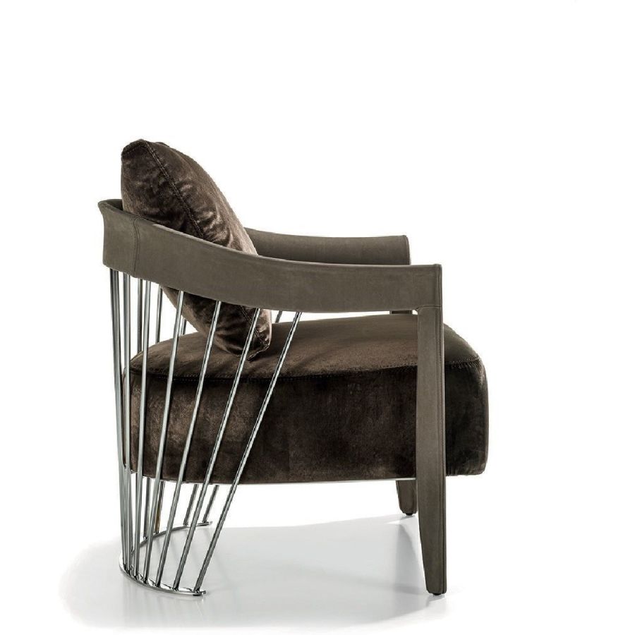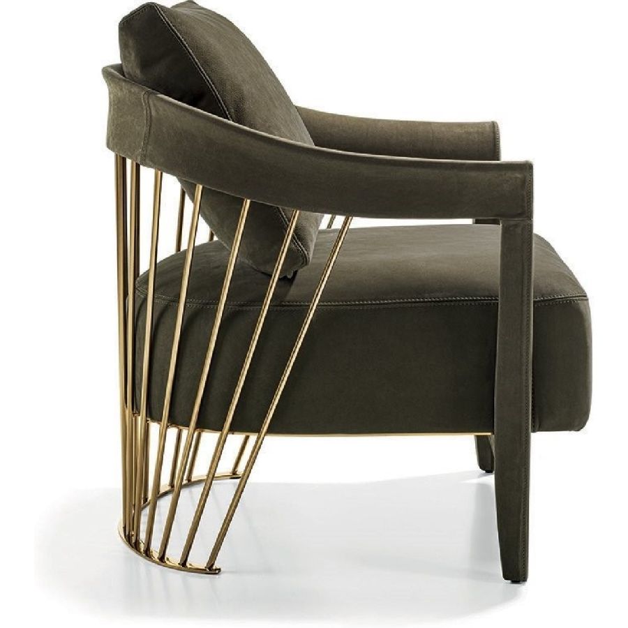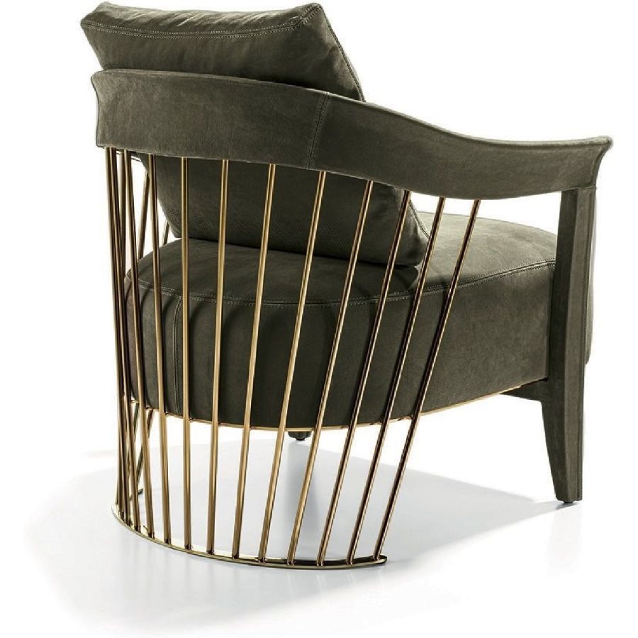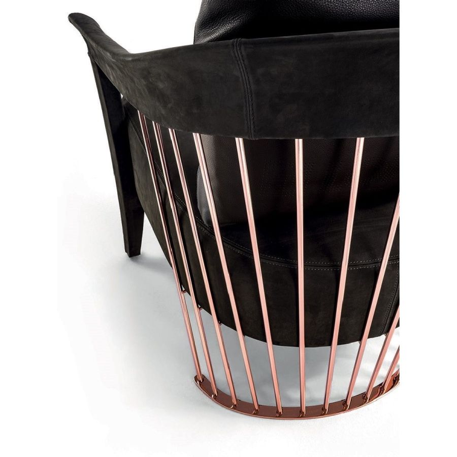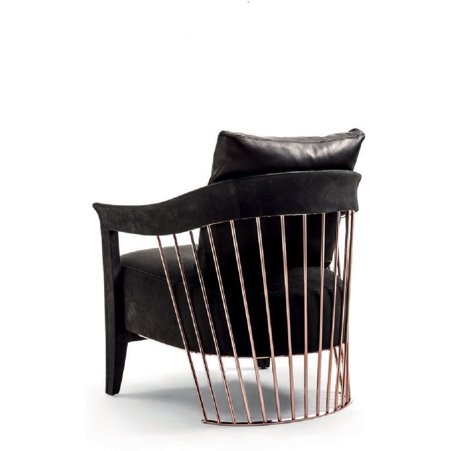 The metal backrest of the armchair is made with a laser-cut frame and by metal pipes assembled individually with a handmade procedure, and chrome plated in the finishes: Satin nickel, bright shaded brown, Black Rose gold, bright light gold, matt Champagne gold, bright chrome, bright black chrome, matt satin bronze, bright pink gold, matt pink gold. The load-bearing structure is cold-moulded in foam with an iron insert, using a designated mould. The upholstery on the structure is available exclusively in hot-glued leather, applied by hand. The seat is in wood and polyurethane foam with three layers of density, with non-removable leather or fabric upholstery. The backrest cushion is in sterilised goose down, covered in removable leather or fabric.
