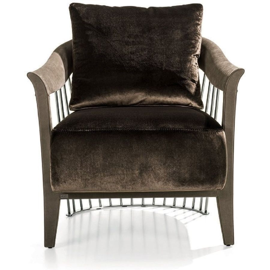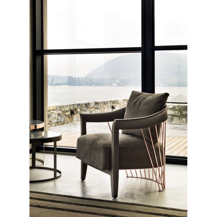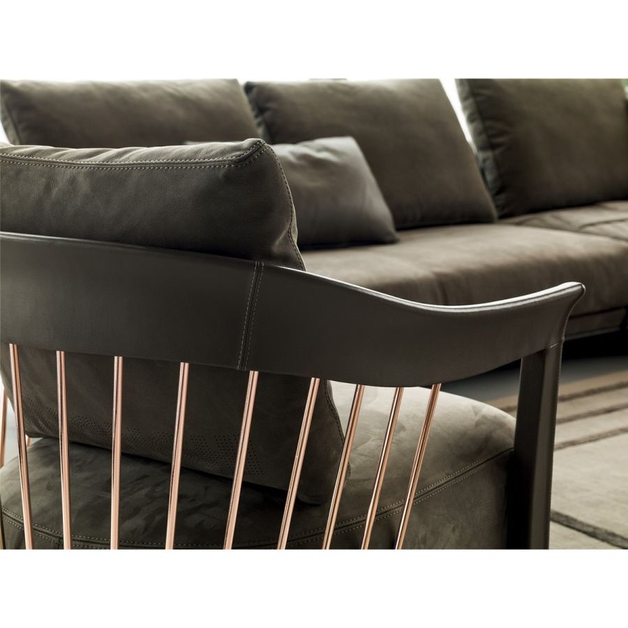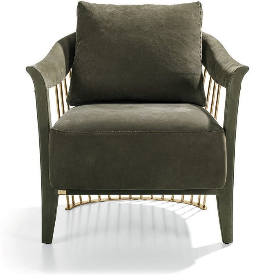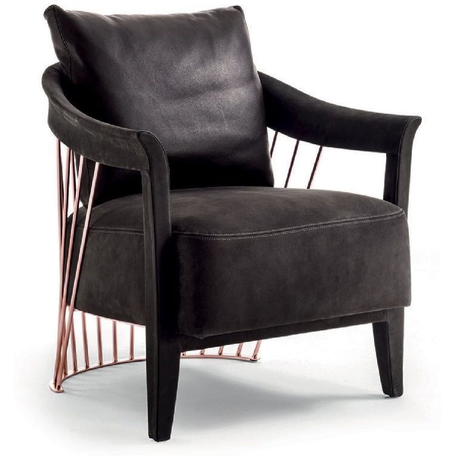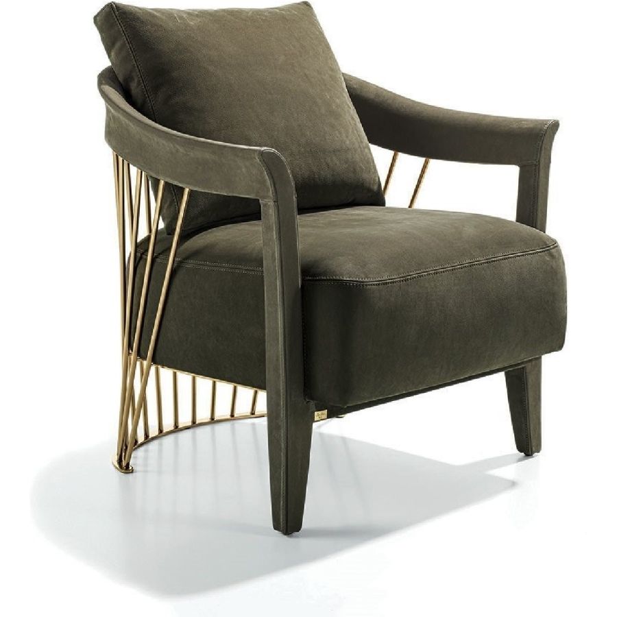 The metal backrest of the armchair is made with a laser-cut frame and by metal pipes assembled individually with a handmade procedure, and chrome plated in the finishes: Satin nickel, bright shaded brown, Black Rose gold, bright light gold, matt Champagne gold, bright chrome, bright black chrome, matt satin bronze, bright pink gold, matt pink gold. The load-bearing structure is cold-moulded in foam with an iron insert, using a designated mould. The upholstery on the structure is available exclusively in hot-glued leather, applied by hand. The seat is in wood and polyurethane foam with three layers of density, with non-removable leather or fabric upholstery. The backrest cushion is in sterilised goose down, covered in removable leather or fabric.