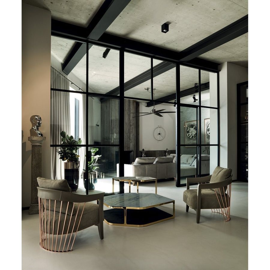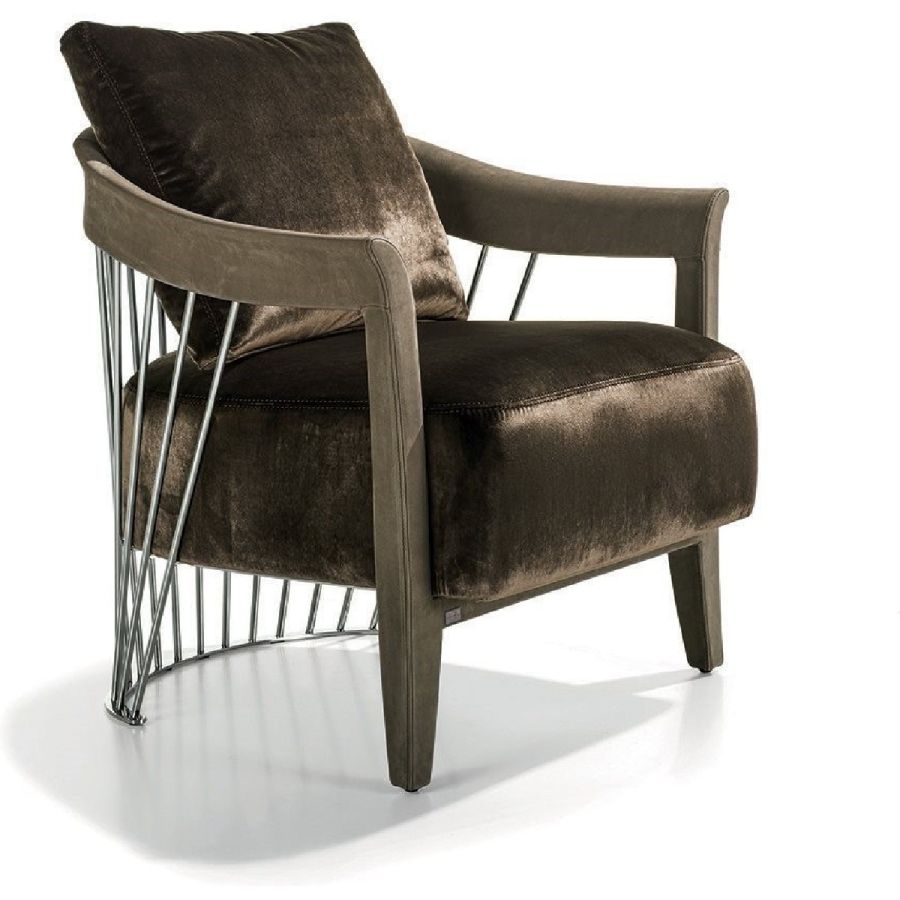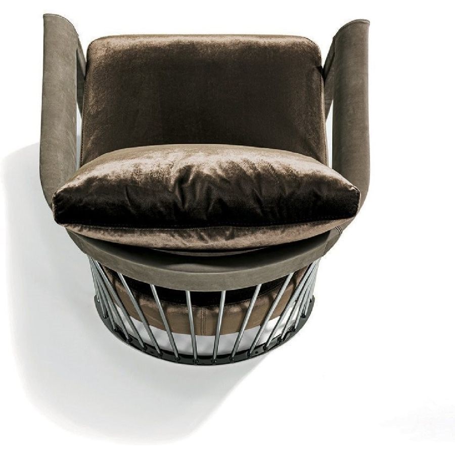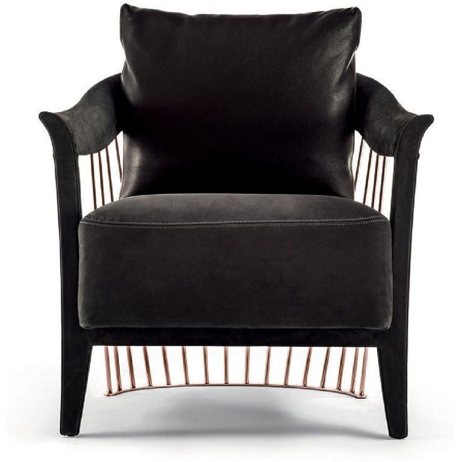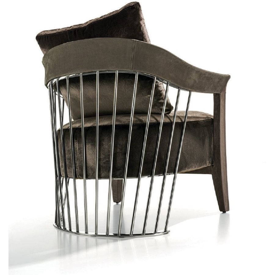 The metal backrest of the armchair is made with a laser-cut frame and by metal pipes assembled individually with a handmade procedure, and chrome plated in the finishes: Satin nickel, bright shaded brown, Black Rose gold, bright light gold, matt Champagne gold, bright chrome, bright black chrome, matt satin bronze, bright pink gold, matt pink gold. The load-bearing structure is cold-moulded in foam with an iron insert, using a designated mould. The upholstery on the structure is available exclusively in hot-glued leather, applied by hand. The seat is in wood and polyurethane foam with three layers of density, with non-removable leather or fabric upholstery. The backrest cushion is in sterilised goose down, covered in removable leather or fabric.