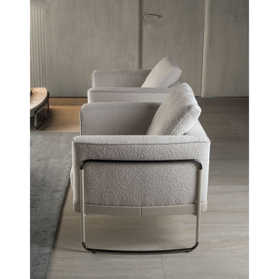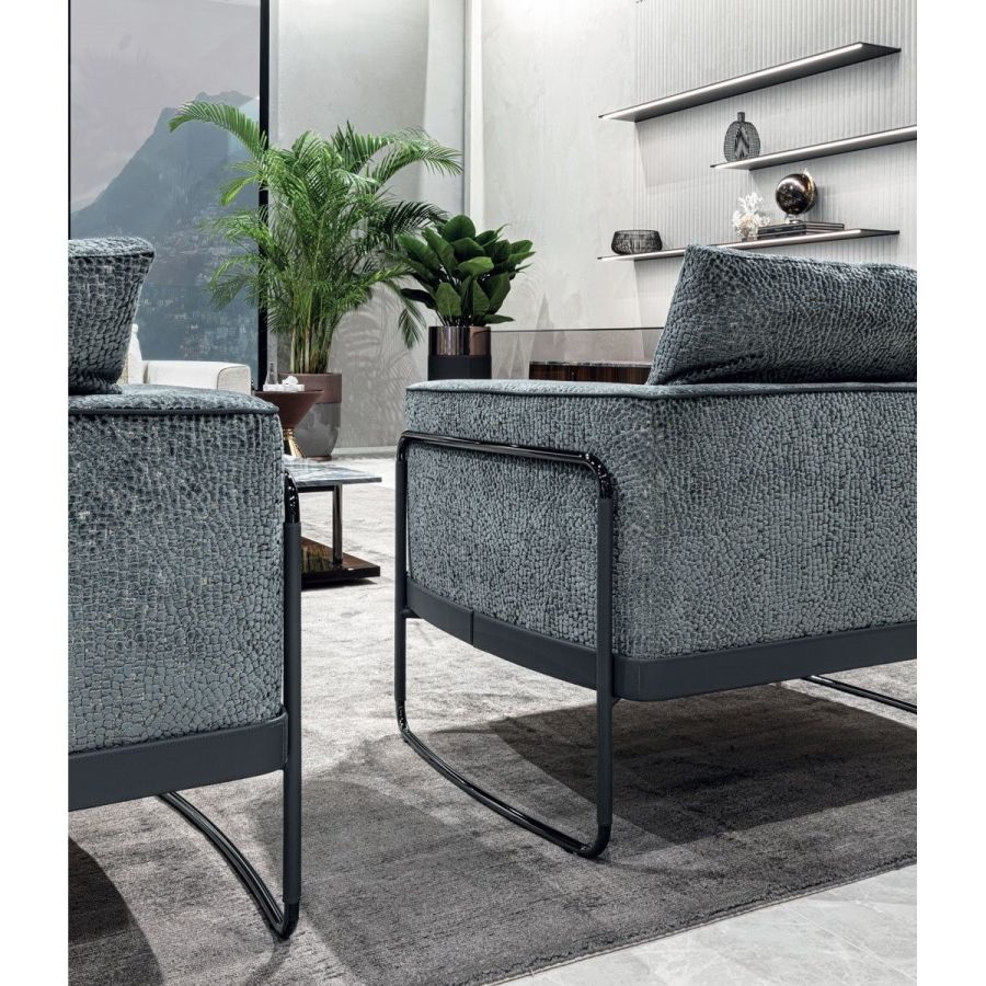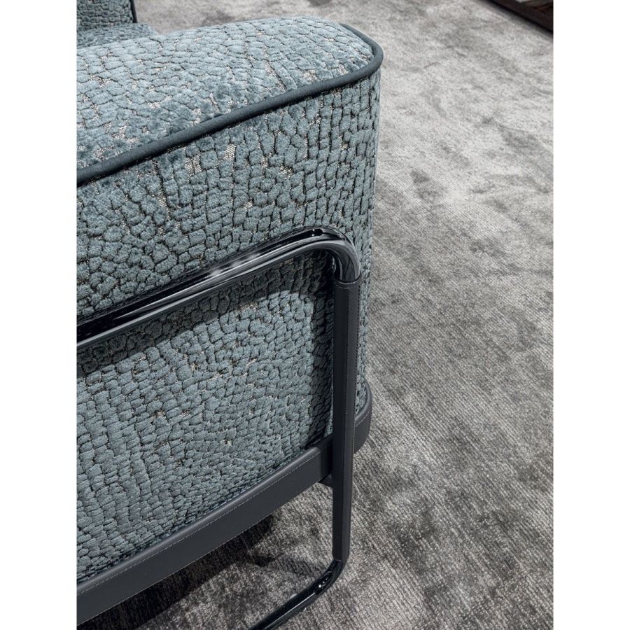 Armchair with a padded structure with external armrests in tubular metal with a wrap-around form, partially covered in a strip of “Renova”, a particular type of sustainable anti-bacterial recycled leather that will match or contrast with the colour of the main armchair upholstery. A metal belt perfectly covered in this new material, which looks like natural full grain leather, is placed in the base. The armchair is supported by a robust metal frame. The upholstered structure is in wood, covered in high density polyurethane foam. The seat cushion is in triple density polyurethane foam, with a soft quilted cover in certified sterilised goose down. The backrest cushion is in certified sterilised goose down. The visible tubular metal parts have the following chrome finishes: Shaded copper, Bright shaded brown, Black Rose gold, bright light gold, Champagne gold, bright chrome, bright black chrome, matt satined bronze. Given the special manufacturing process, the structure upholstery is NOT removable, but the seat cushion upholstery is removable.