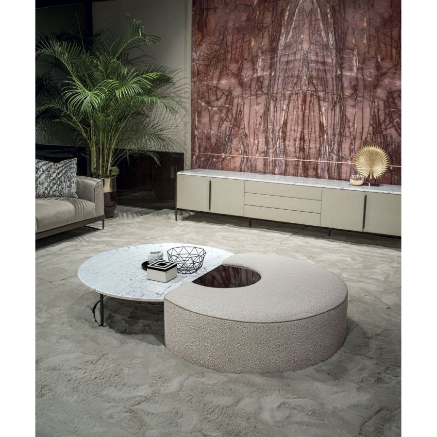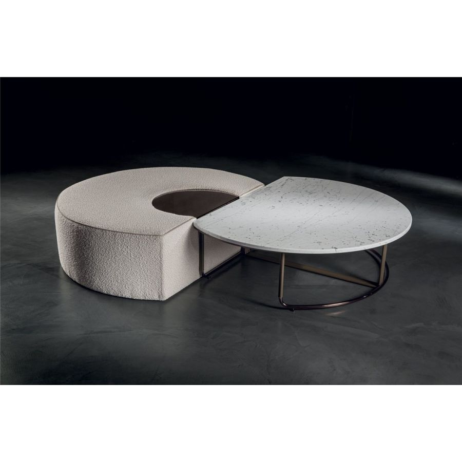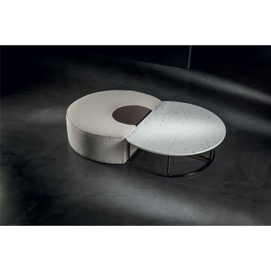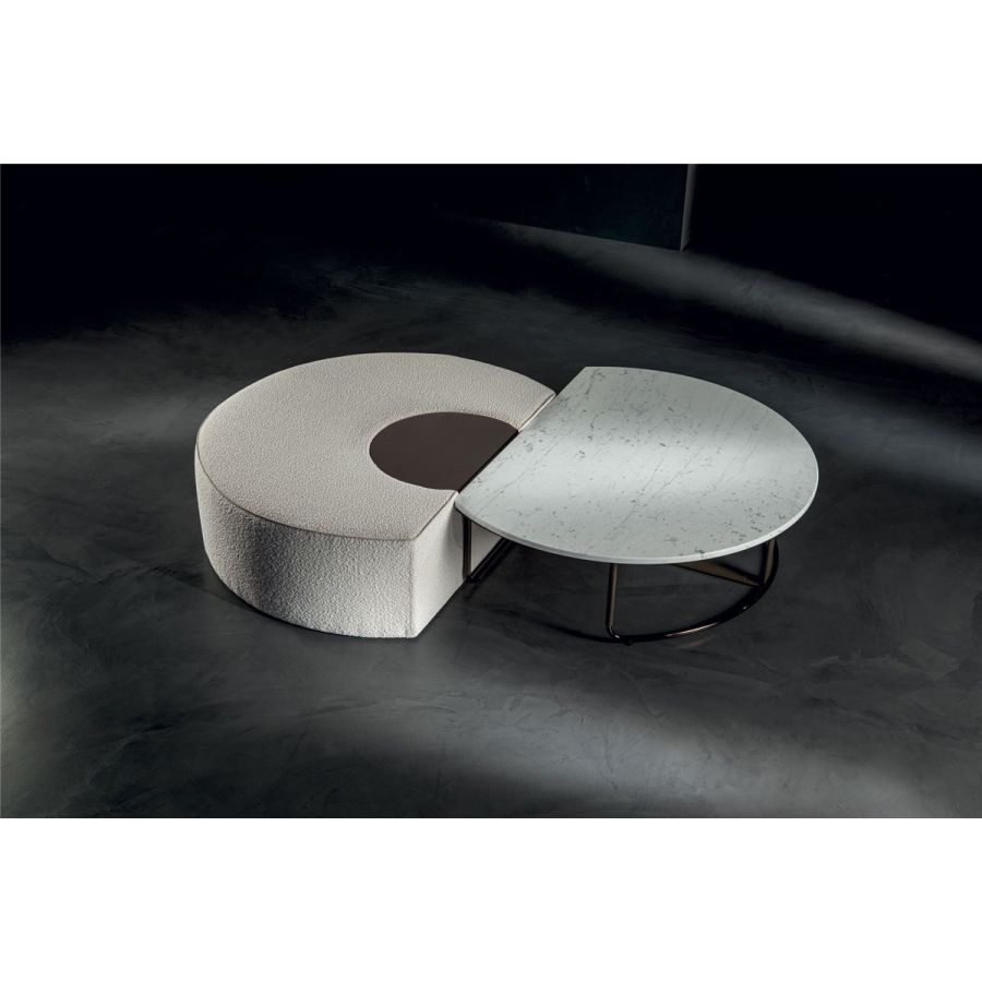 Toby small tables are characterised by a strong material presence, evident in the versions where marble and wood are used together in contrast with the aesthetics of the top. The pouf of the same name is the perfect complement. The Toby pouf is also semi-circular and the same height as the small table, enabling them to be used together in original compositions. Sophisticated aesthetic language expressed in soft shapes, limited proportions and details with striking visual impact, such as the metal service top.