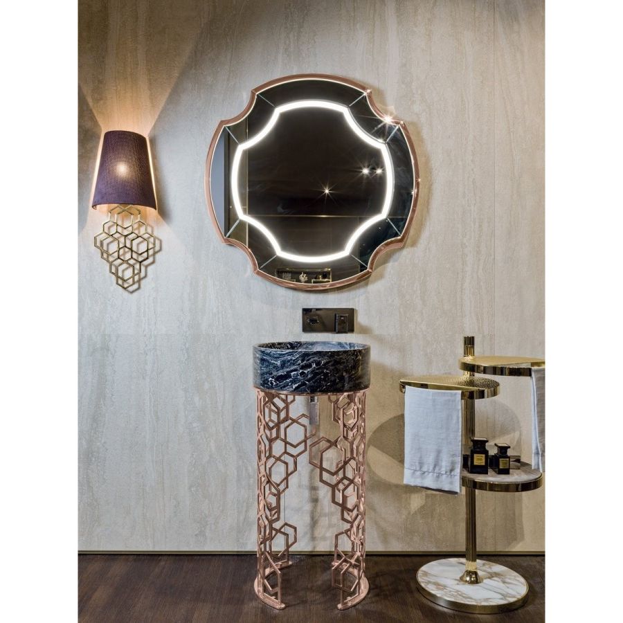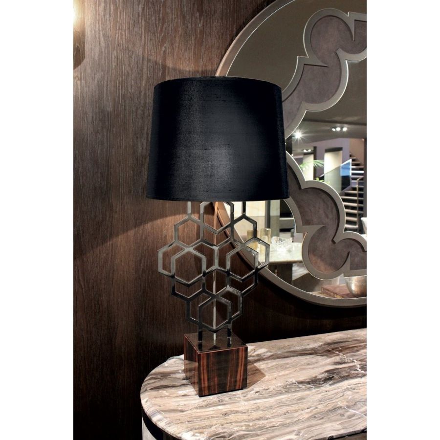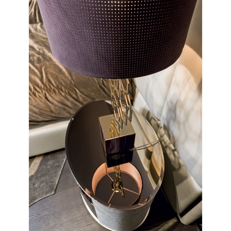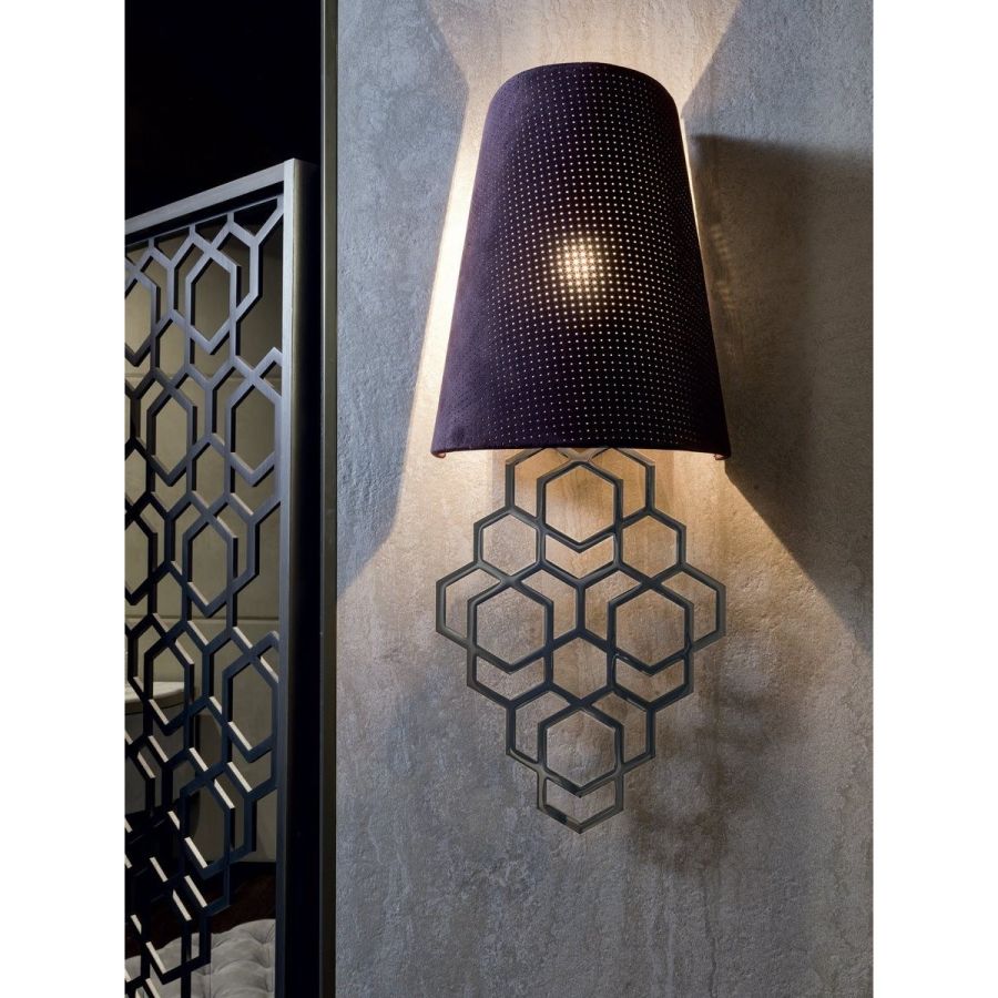 Table lamp and wall light in ground metal with laser cut “Sequence” decoration in the finishes: Black Rose gold, bright pink gold, matt pink gold, bright shaded brown, bright light gold, matt Champagne gold, bright chrome, bright black chrome, matt satined bronze. Cubic base in wood finishes: Glossy Sycamore frisè, Glossy ebony, Glossy walnut burl wood. Lamp shade in P.3 cat. Suede perforated leather, in sample colours or in satin fabric in colours white, black, beige, and red, or natural linen. Standard electrical system 230V, 50Hz - E27. Optional electrical system 120V, 60Hz - E26.