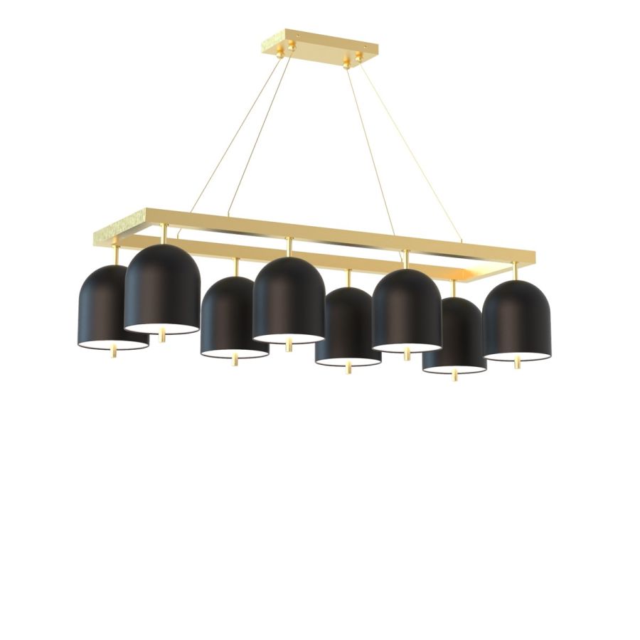 Conceived and composed of a structure and rectangular ceiling fixing base in brass, in the precious light gold finish. Complete with eight black painted metal caps and methacrylate diffuser. Available in various colors.