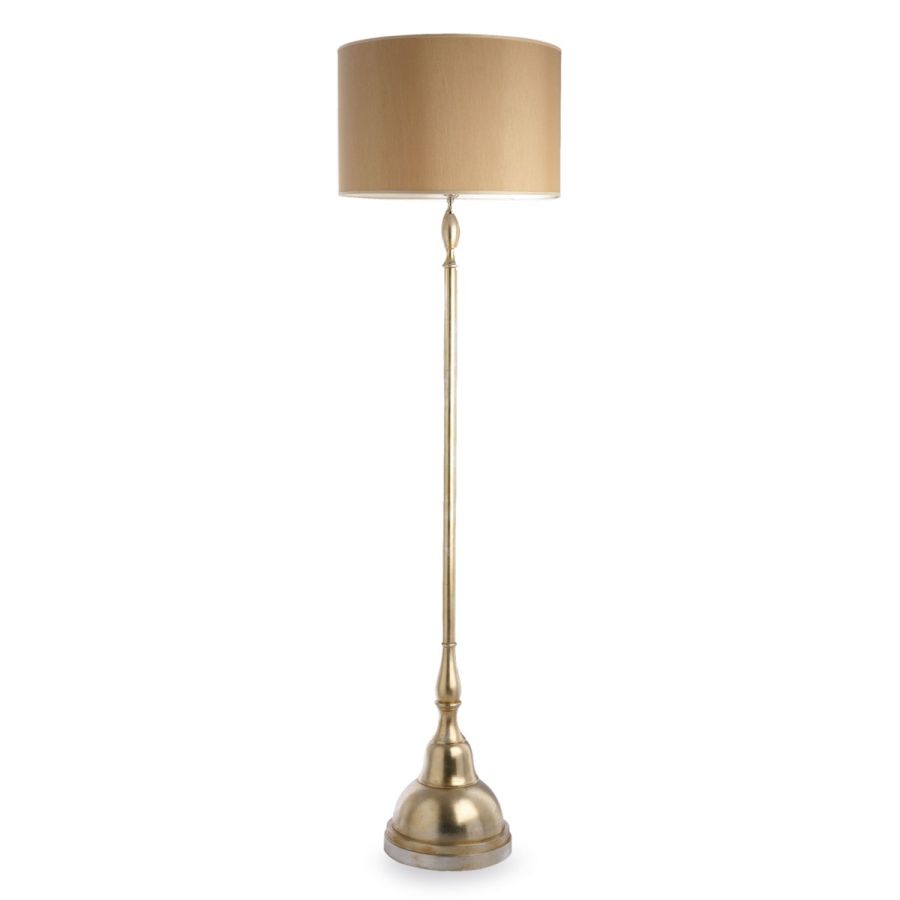 Elegant floor lamp in classic style for rooms and common areas, composed of a linear stem and a round base in wood decorated with silver leaf.