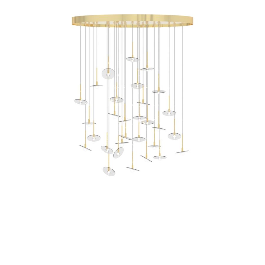 Inspired by a contemporary and sophisticated design, this chandelier ideal for living rooms and living areas is a clear example of aesthetic and practical functionality. Composed of an upper metal structure in the precious light gold finish and n. 30 suspended elements and adjustable transparent methacrylate details.